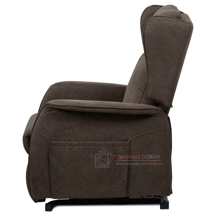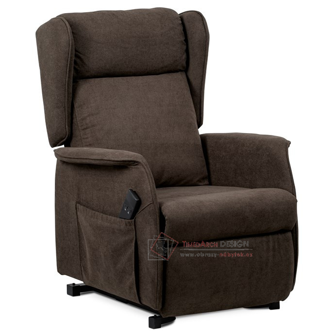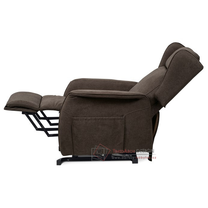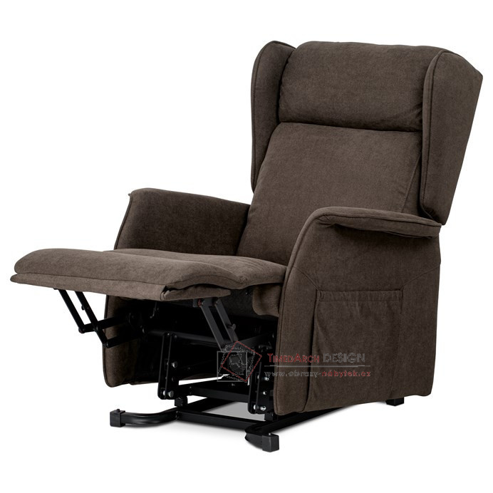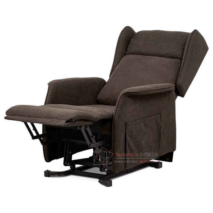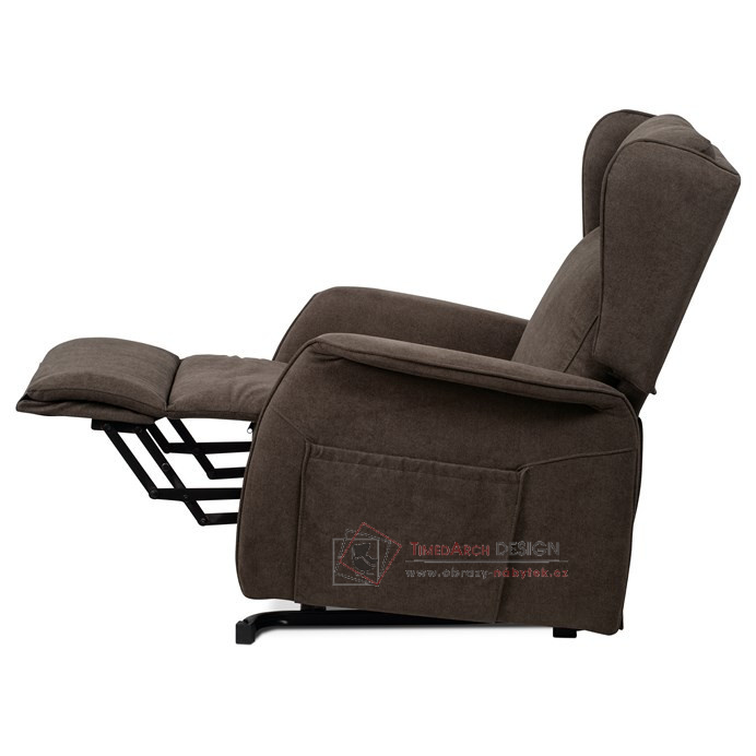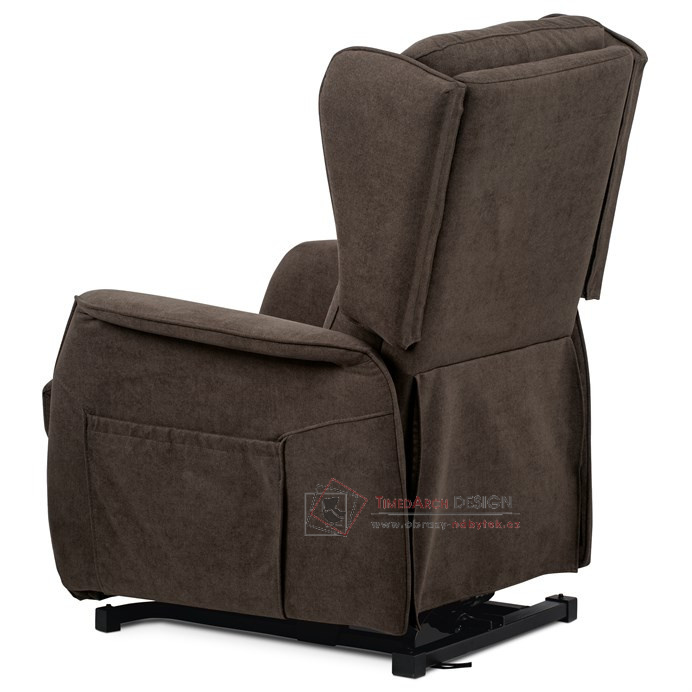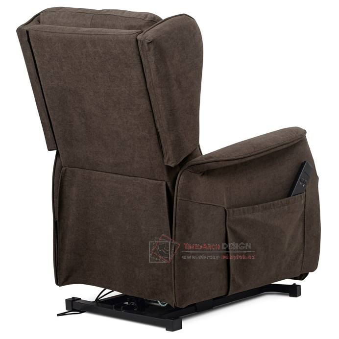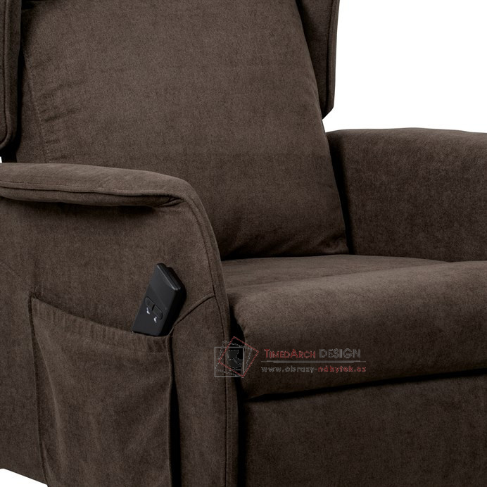 Potah je z příjemné a měkké látky hnědé barvy. Masivní a kovová konstrukce, polstrování z PU pěny, vlnovce a zpevňující popruhy dodávají skvělé pohodlí a pevnost. Integrovaný motor pomáhá nejen při vstávání, ale i při nastavení relaxace v jakékoliv požadované poloze. Ovládání pomocí kabelového dálkového ovladače, umístěného v praktické kapse, je opravdu hračkou. Druhou kapsu můžete využít nejen na knížku, ovladač na TV nebo jí naplnit bonbóny na mlsání. Úplný rozklad zvládne křeslo za 16 sekund, výklop za 13 sekund (nezatížené). Šíře područek je 11 cm, výška 56 cm a světlá výška křesla je 8 cm. Tímto vším si ho prostě zamilujete a již nikdy nebudete chtít opustit své nové televizní křeslo.