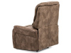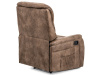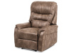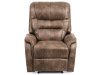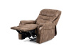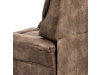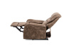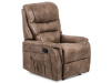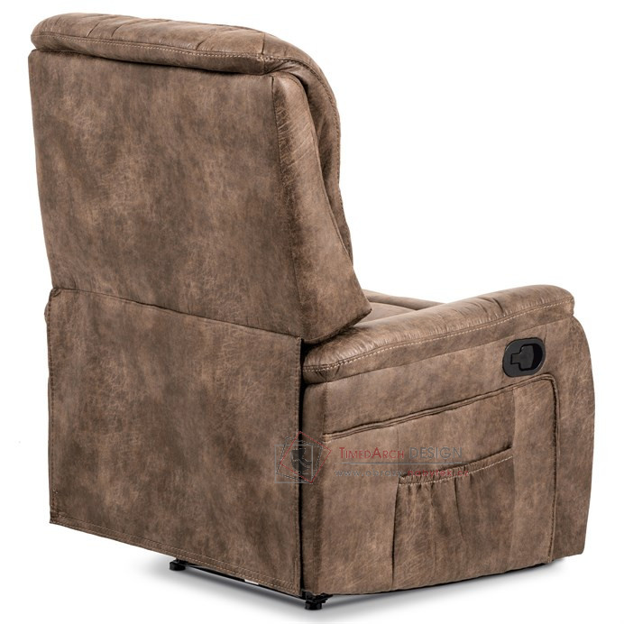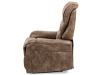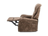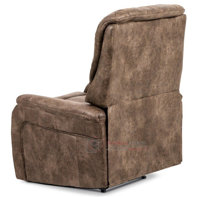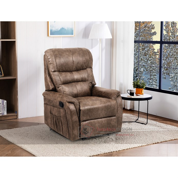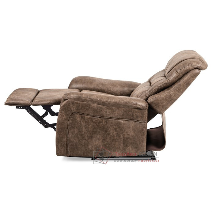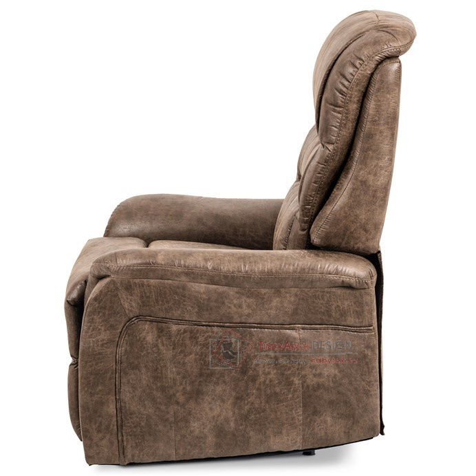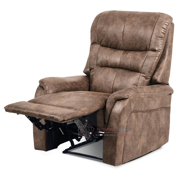 Pohodlné televizní křeslo s příjemnou látkou hnědé barvy imitující broušenou kůži je na stabilní kovové podnoži.