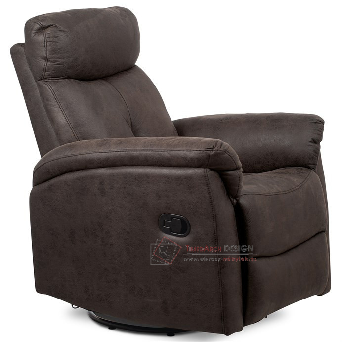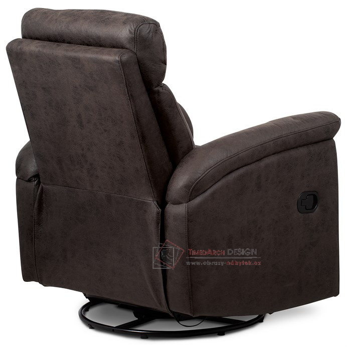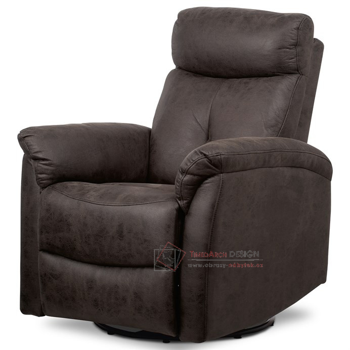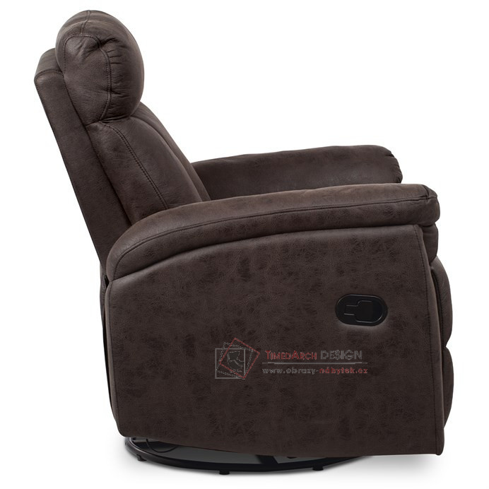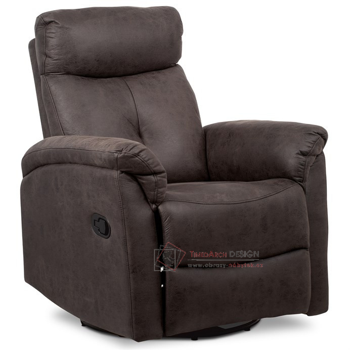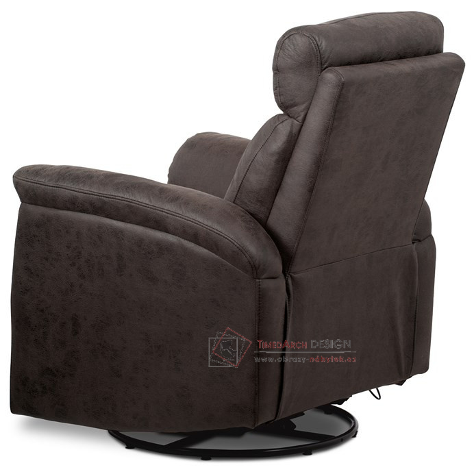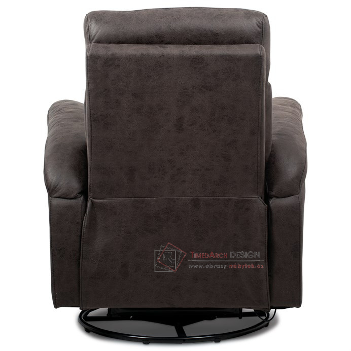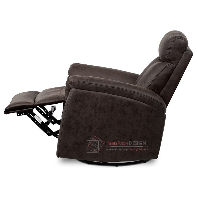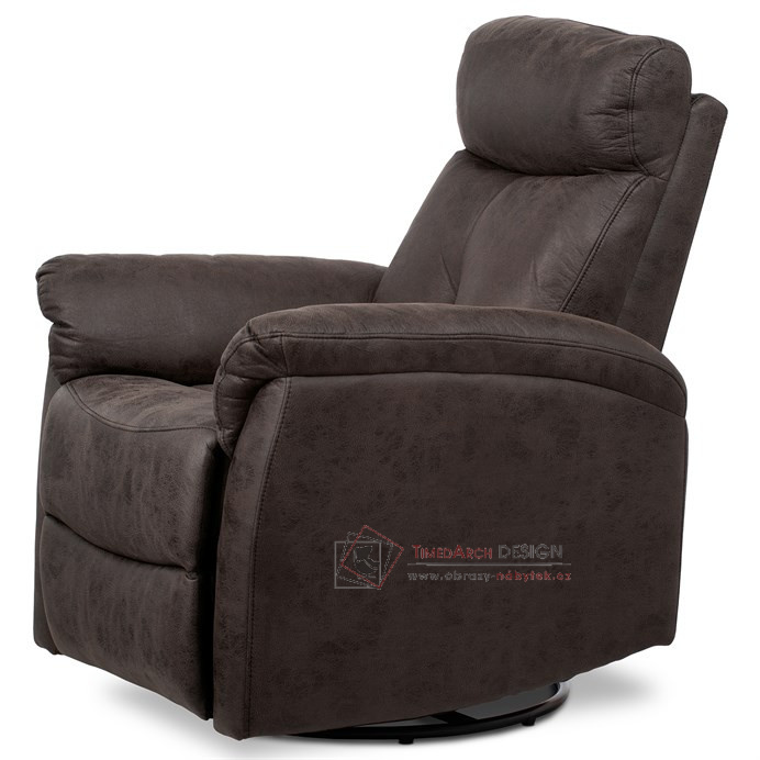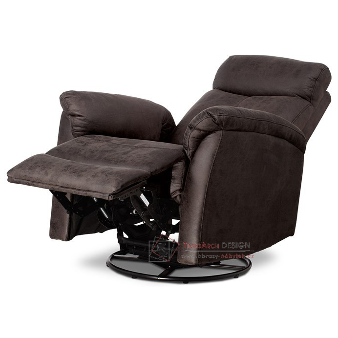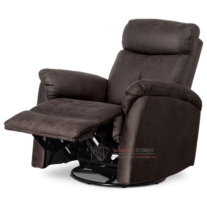 Potah je z hnědé látky v dekoru kůže. Kostra z masivního dřeva, boky jsou z překližky. Mechanická konstrukce je kovová, černě lakovaná. Výplň z PU pěny 28D na sedacích plochách, 22D na bocích a 3 vlnovcových pružin v místě sedáku. Křeslo má řadu skvělých a nadstandardních funkcí - polohování ve dvou pozicích s aretací, ale je také otočné o 360°a navíc ještě i houpací. TOP relaxace ve všech polohách. Nosnost křesla je 130 kg.
