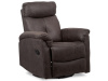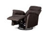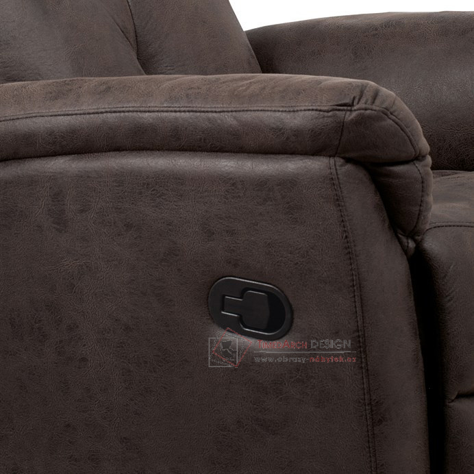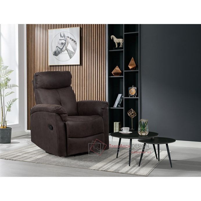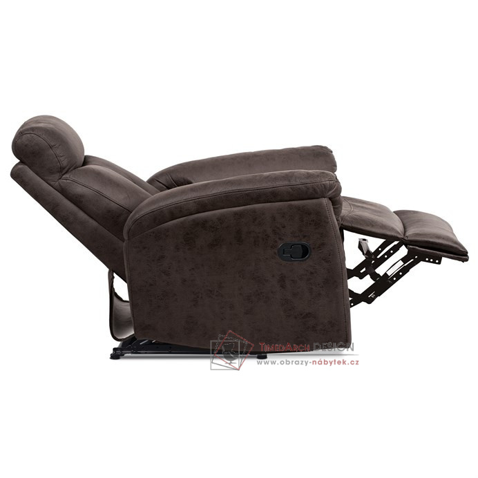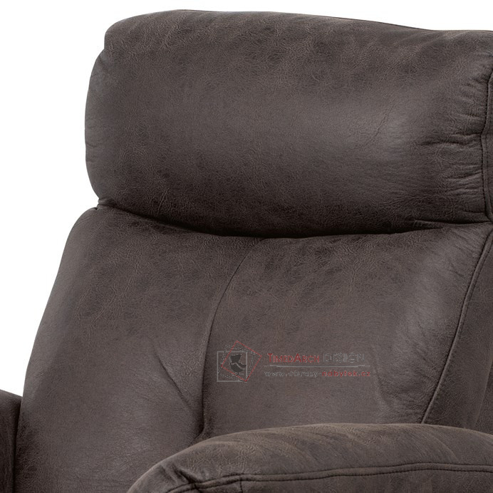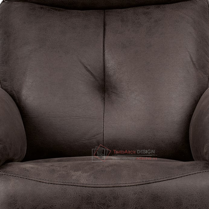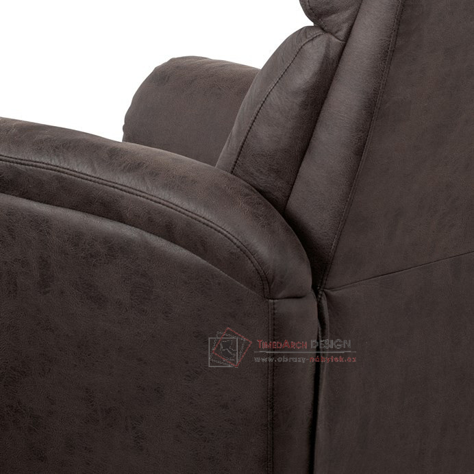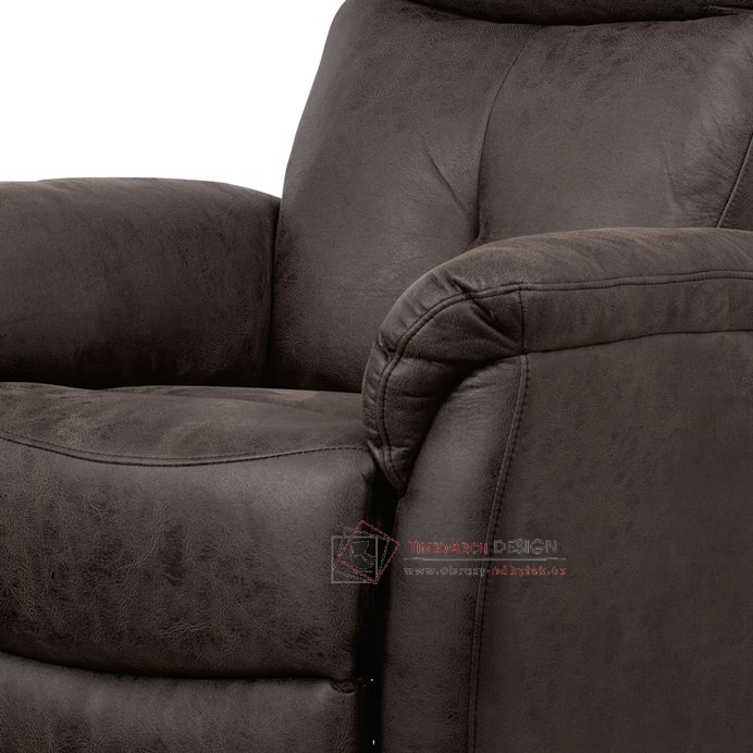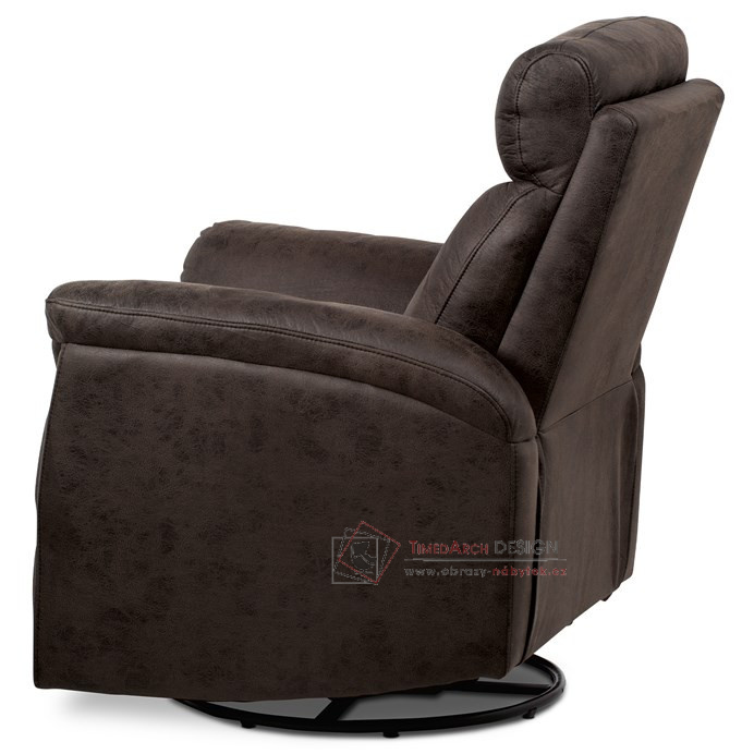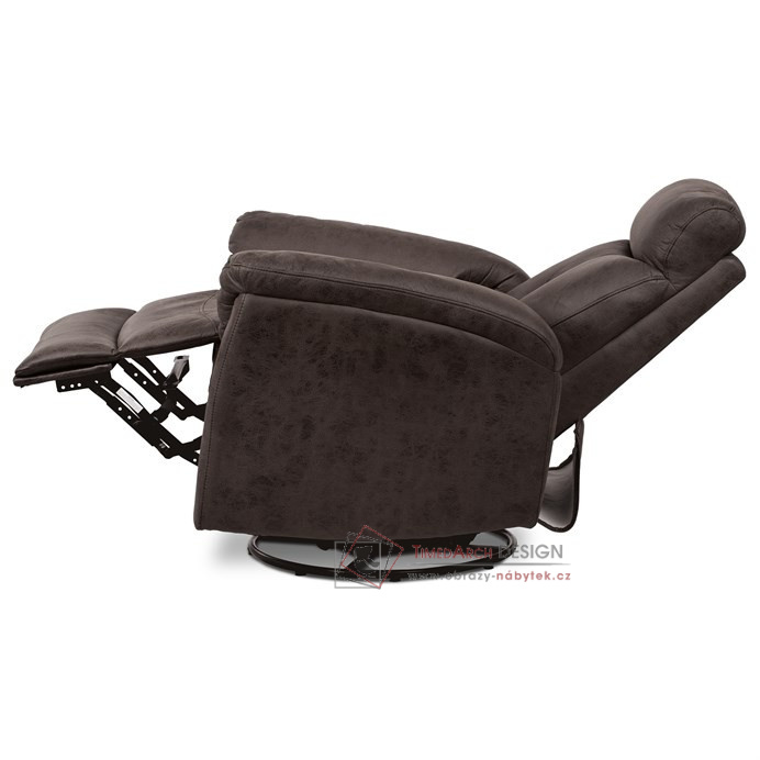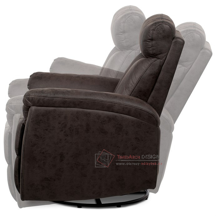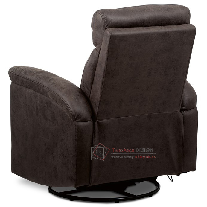 Potah je z hnědé látky v dekoru kůže. Kostra z masivního dřeva, boky jsou z překližky. Mechanická konstrukce je kovová, černě lakovaná. Výplň z PU pěny 28D na sedacích plochách, 22D na bocích a 3 vlnovcových pružin v místě sedáku. Křeslo má řadu skvělých a nadstandardních funkcí - polohování ve dvou pozicích s aretací, ale je také otočné o 360°a navíc ještě i houpací. TOP relaxace ve všech polohách. Nosnost křesla je 130 kg.