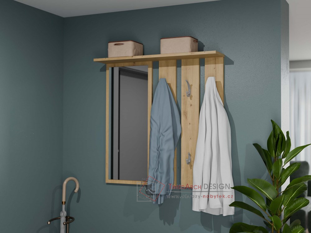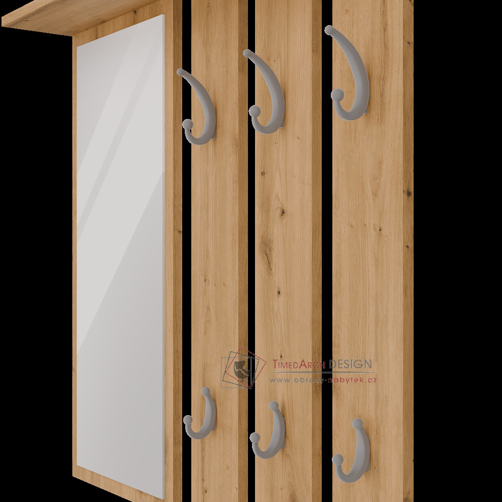 Věšákový panel s policí Granát se připevňuje na stěnu a lze jej doplnit botníkem Granát.