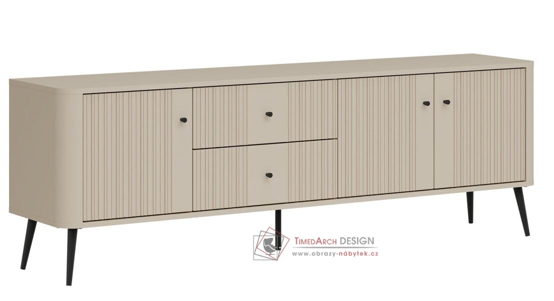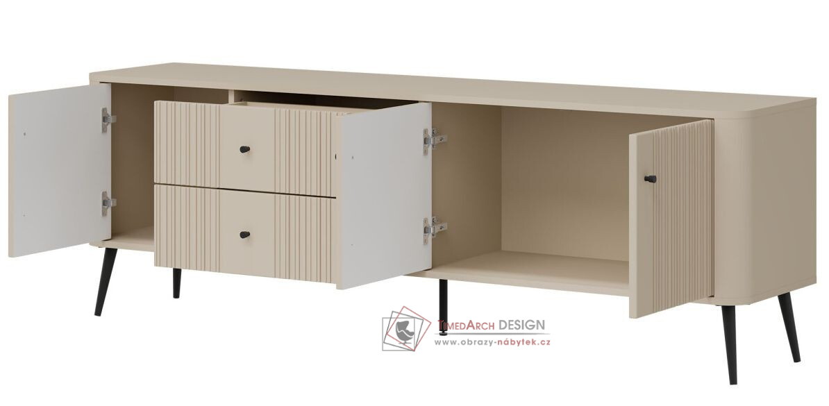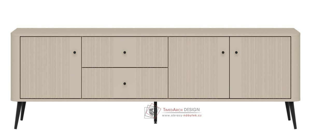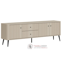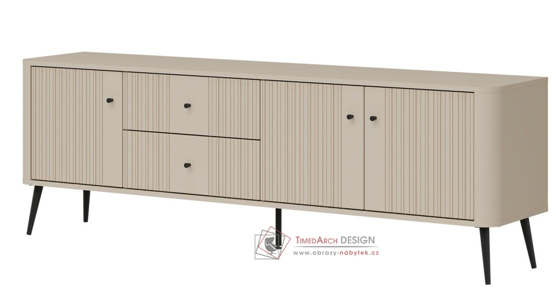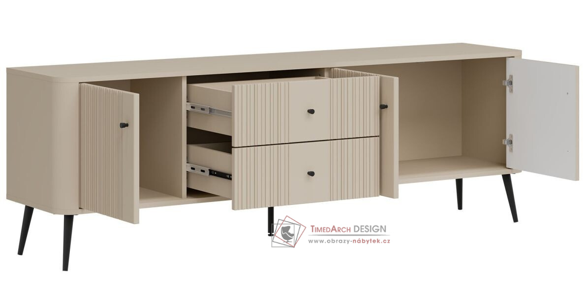 Svislé drážky na čelních stěnách dodávají nábytku vytříbenou texturu a přitahují pozornost svou jedinečnou strukturou. Zaoblené boky propůjčují kolekci jemný a harmonický vzhled, který dokonale doplňuje moderní interiéry. Černé kovové nohy a úchytky kontrastují s teplým kašmírovým odstínem a vytvářejí stylový a nadčasový efekt. Tento nábytek je dokonalou kombinací funkčnosti a estetiky, která promění jakýkoli prostor. Vitríny z této kolekce lze vybavit přídavným LED osvětlením, které zvýrazňuje jejich krásu a dodává interiéru jedinečnou atmosféru.