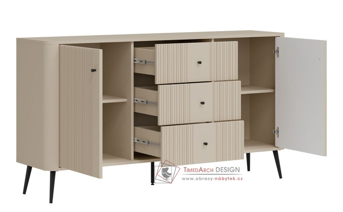 Svislé drážky na čelních stěnách dodávají nábytku vytříbenou texturu a přitahují pozornost svou jedinečnou strukturou. Zaoblené boky propůjčují kolekci jemný a harmonický vzhled, který dokonale doplňuje moderní interiéry. Černé kovové nohy a úchytky kontrastují s teplým kašmírovým odstínem a vytvářejí stylový a nadčasový efekt. Tento nábytek je dokonalou kombinací funkčnosti a estetiky, která promění jakýkoli prostor. Vitríny z této kolekce lze vybavit přídavným LED osvětlením, které zvýrazňuje jejich krásu a dodává interiéru jedinečnou atmosféru.