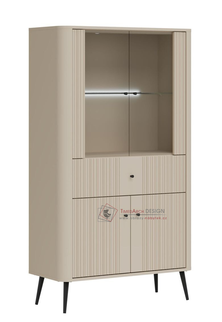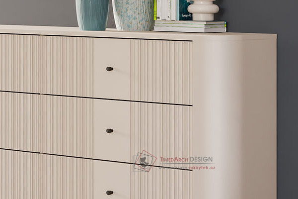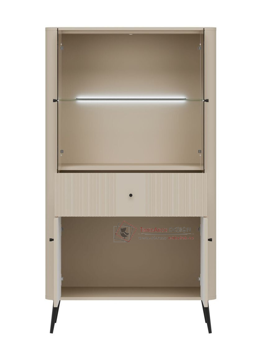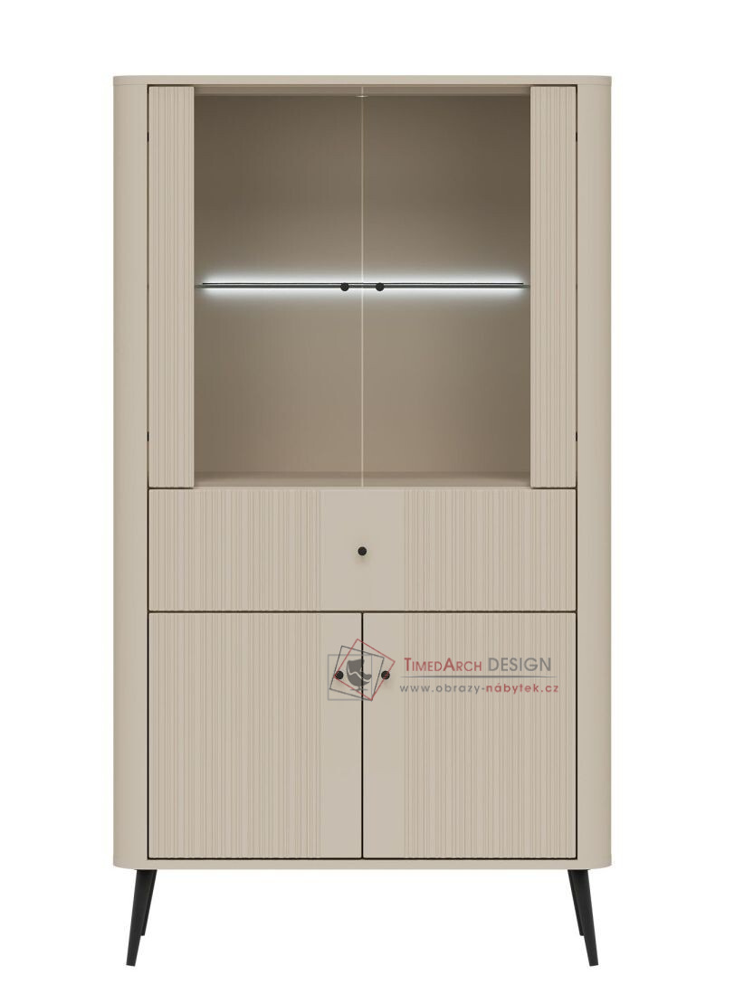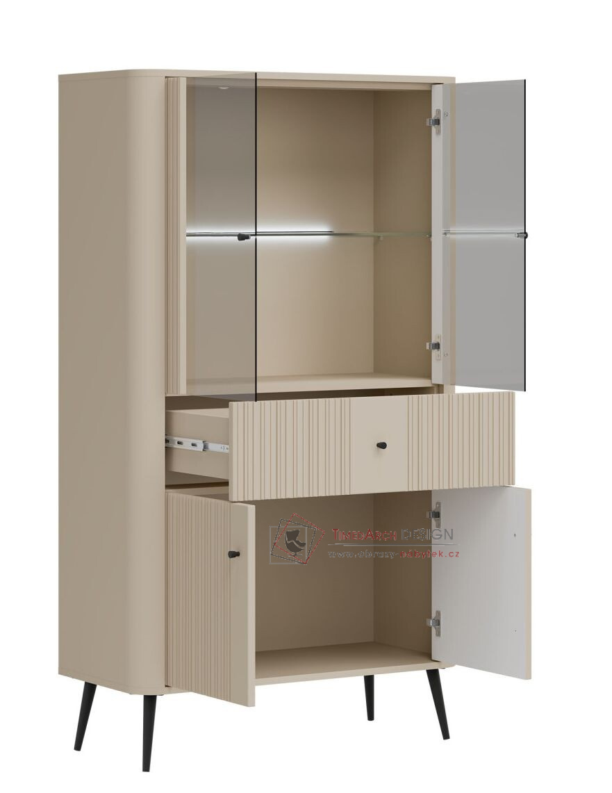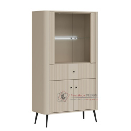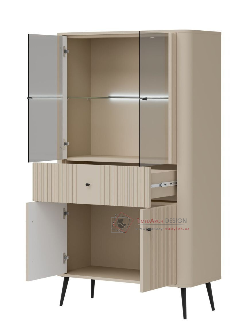Svislé drážky na čelních stěnách dodávají nábytku vytříbenou texturu a přitahují pozornost svou jedinečnou strukturou. Zaoblené boky propůjčují kolekci jemný a harmonický vzhled, který dokonale doplňuje moderní interiéry. Černé kovové nohy a úchytky kontrastují s teplým kašmírovým odstínem a vytvářejí stylový a nadčasový efekt. Tento nábytek je dokonalou kombinací funkčnosti a estetiky, která promění jakýkoli prostor. Vitríny z této kolekce lze vybavit přídavným LED osvětlením, které zvýrazňuje jejich krásu a dodává interiéru jedinečnou atmosféru.