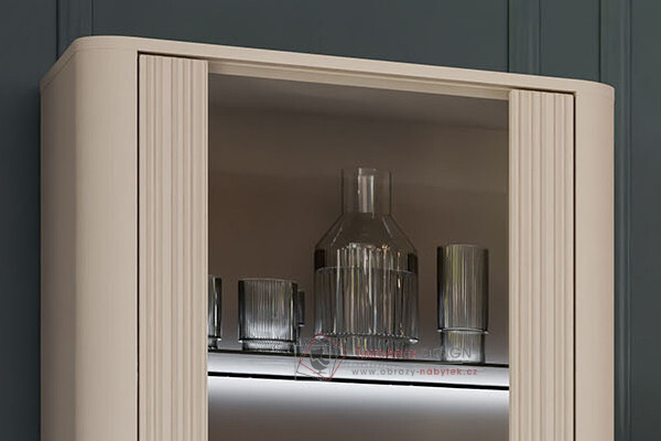 Svislé drážky na čelních stěnách dodávají nábytku vytříbenou texturu a přitahují pozornost svou jedinečnou strukturou. Zaoblené boky propůjčují kolekci jemný a harmonický vzhled, který dokonale doplňuje moderní interiéry. Černé kovové nohy a úchytky kontrastují s teplým kašmírovým odstínem a vytvářejí stylový a nadčasový efekt. Tento nábytek je dokonalou kombinací funkčnosti a estetiky, která promění jakýkoli prostor. Vitríny z této kolekce lze vybavit přídavným LED osvětlením, které zvýrazňuje jejich krásu a dodává interiéru jedinečnou atmosféru.