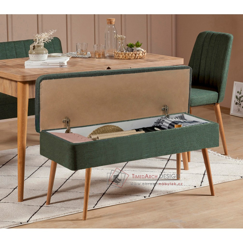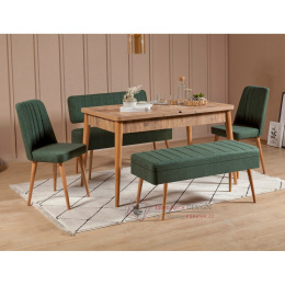 Povrchová úprava jídelního stolu a židlí z atlantského borovice dodá každému prostoru nádech sofistikovanosti, zatímco zářivá zelená barva látkových sedáků přináší osvěžující barevný akcent. Tato kombinace vytváří harmonickou směs, která okamžitě pozvedne styl vašeho domova.