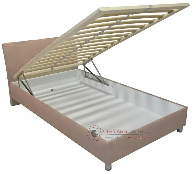 Maximálně pohodlná a praktická postel s pevně načalouněnou matrací na lamelovém roštu, s výškou lehací plochy cca 44 nebo 50 cm dle výběru výšky nožek postele. Postelový rošt je lamelový s úložným prostorem přístupným od nohou. Matrace s polyuretanovým jádrem, s jádrem MANA nebo s jádrem BONO. Možnost proševu matrace.