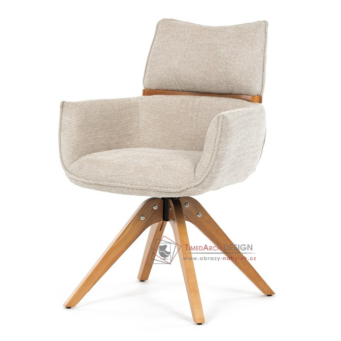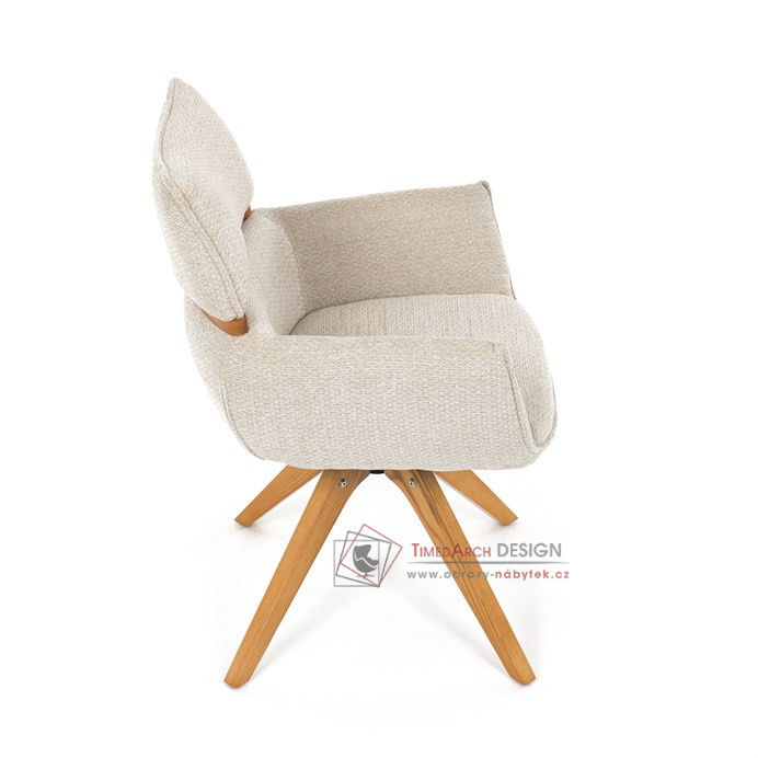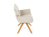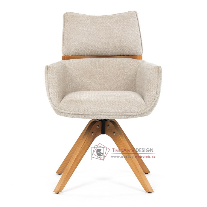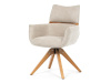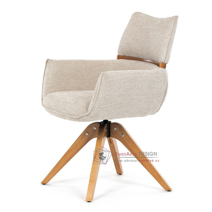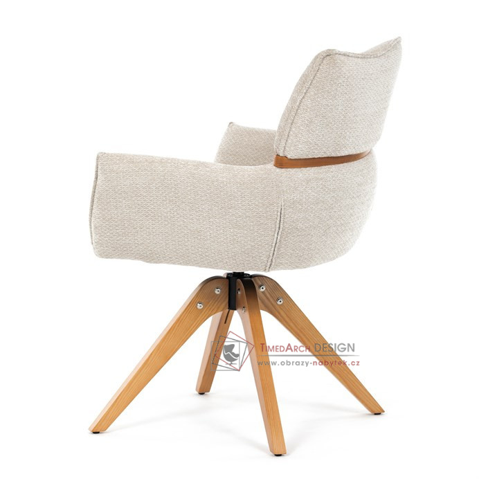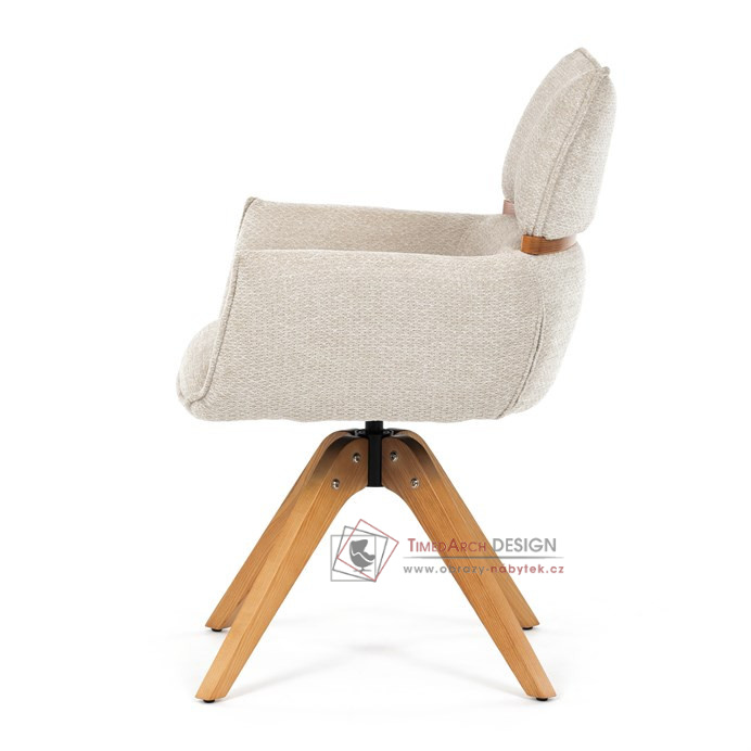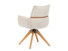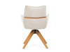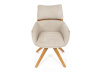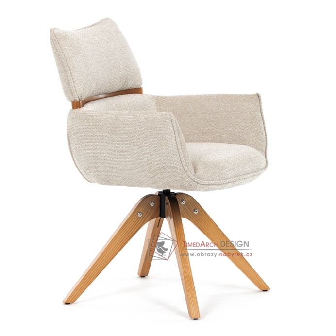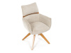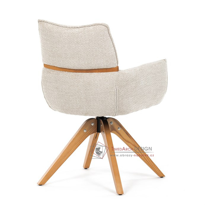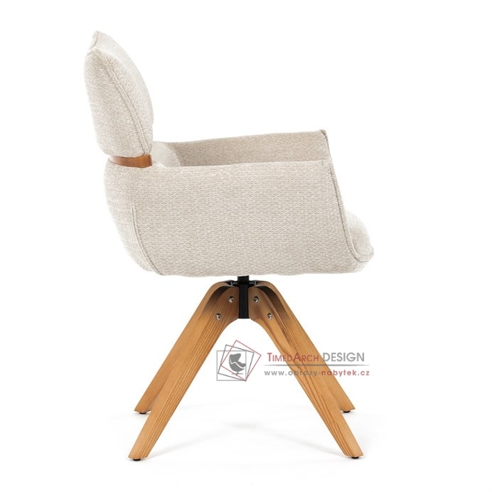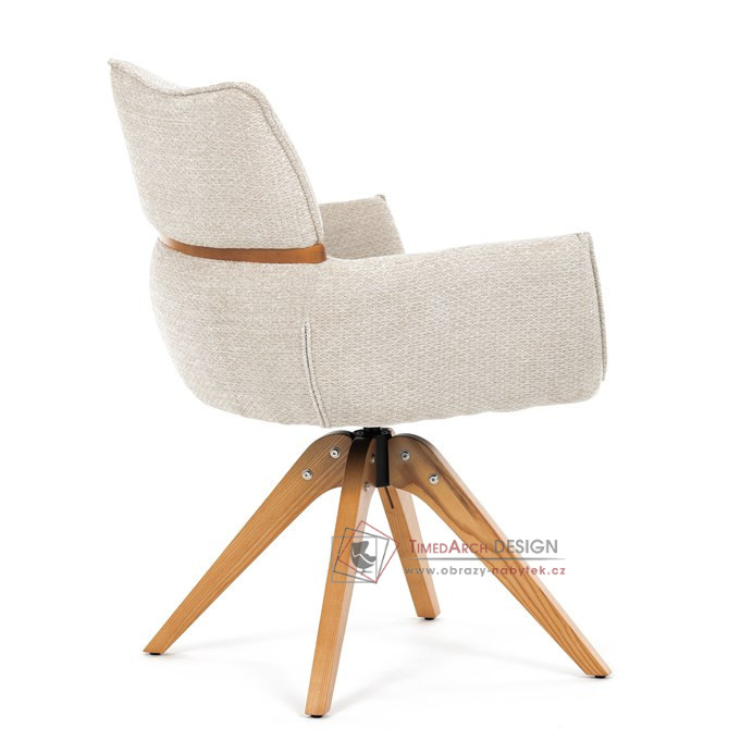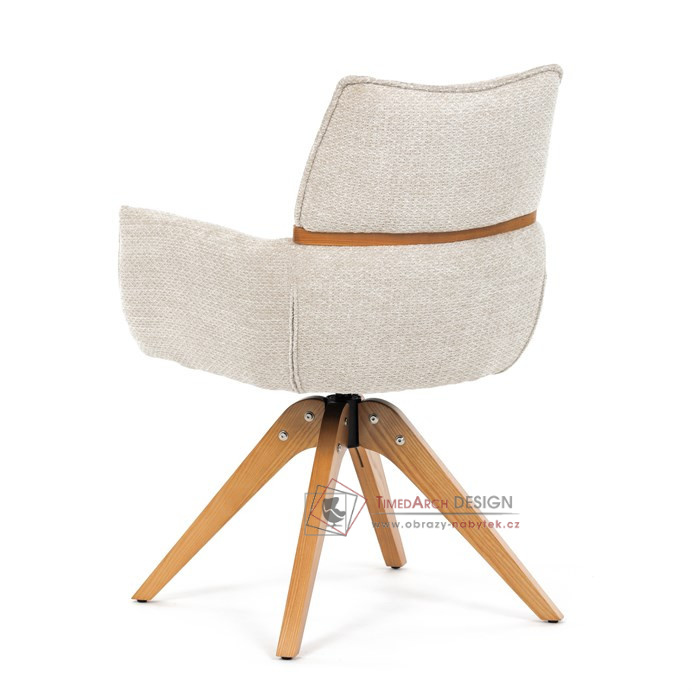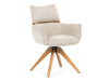 Jeho čalounění z hladké látky v kombinaci s měkkou PU pěnou poskytuje maximální komfort. Stabilitu zajišťují masivní dřevěné nohy v přírodním odstínu, který podtrhuje skandinávský styl. Díky otočné funkci o 360° s vratným mechanismem nabízí flexibilitu při sezení. Područky a dekorativní masivní prvky dodávají židli sofistikovaný vzhled. Ideální doplněk do moderní jídelny, který spojuje zábavu a praktičnost.