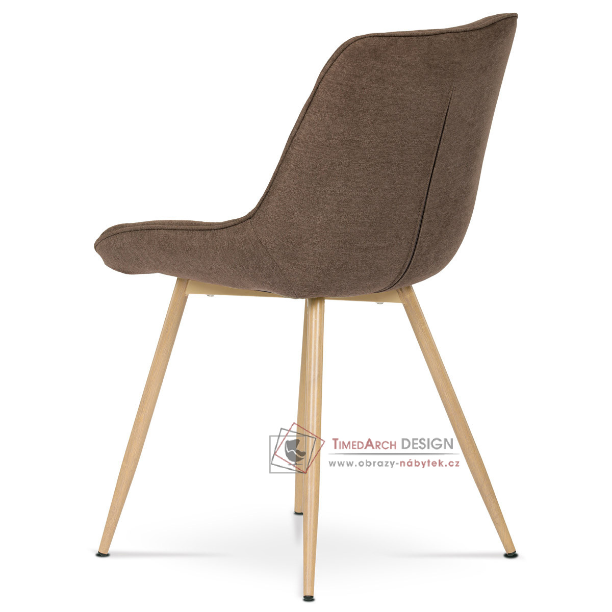 Designová skořepinová jídelní židle je čalouněna hnědou látkou s výrazným prošitím sedací části i části určené k opření.