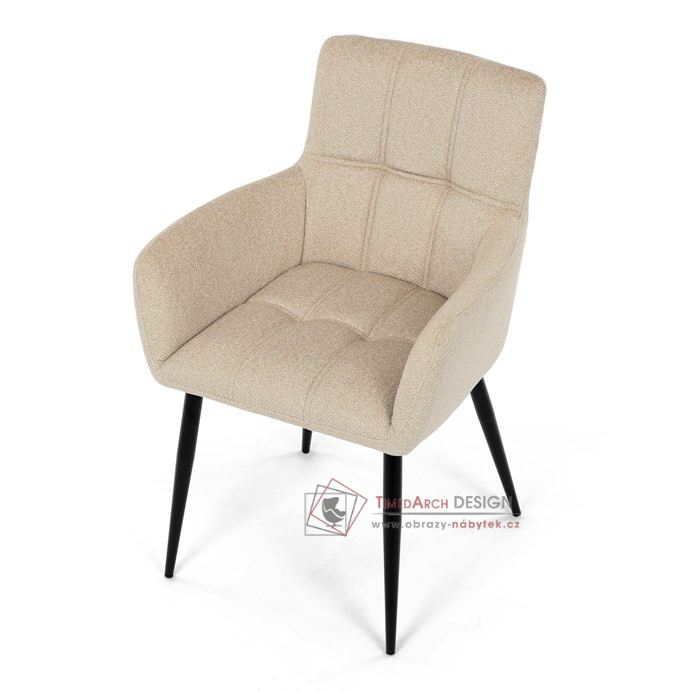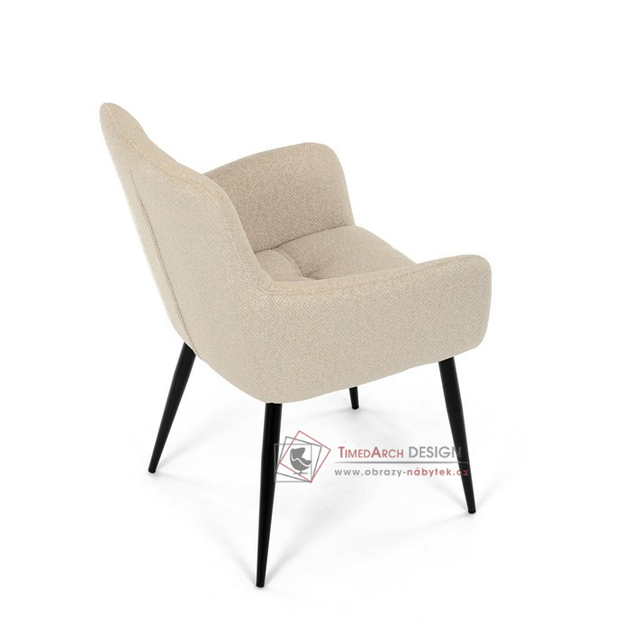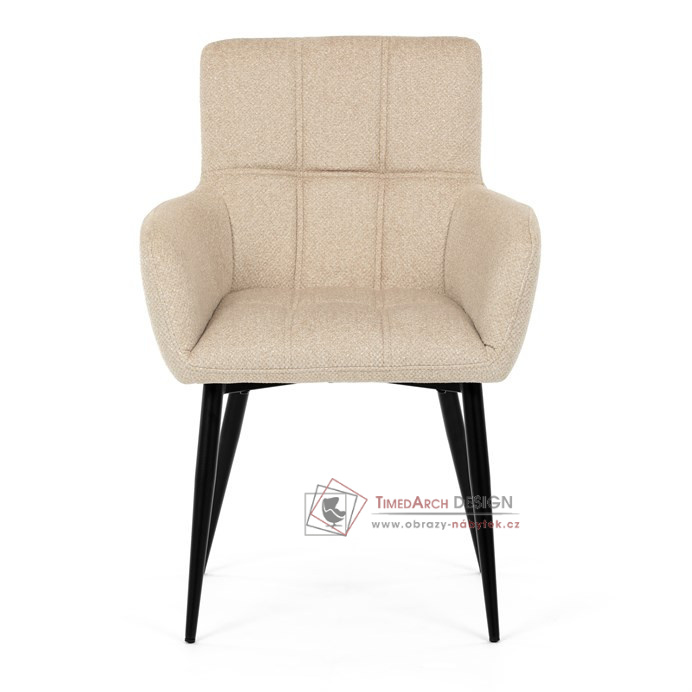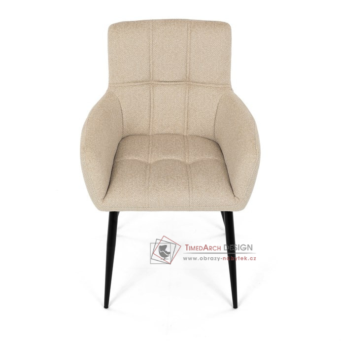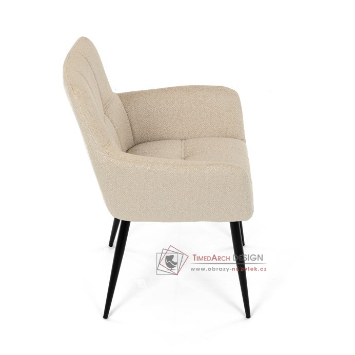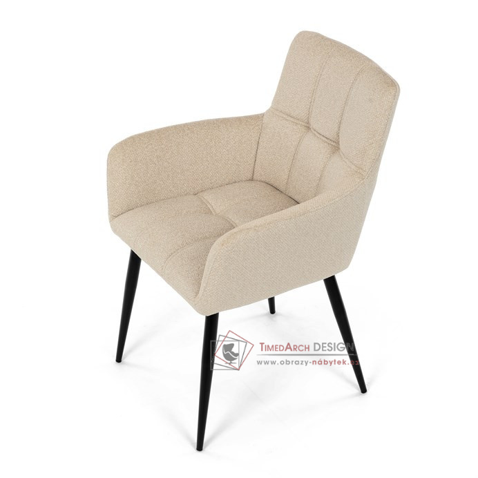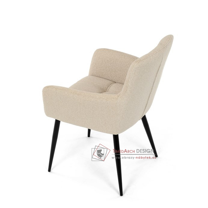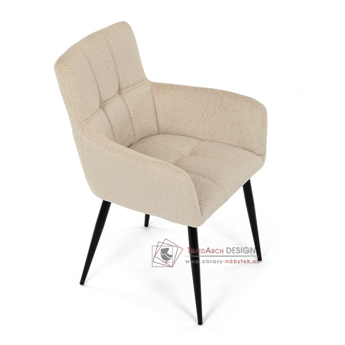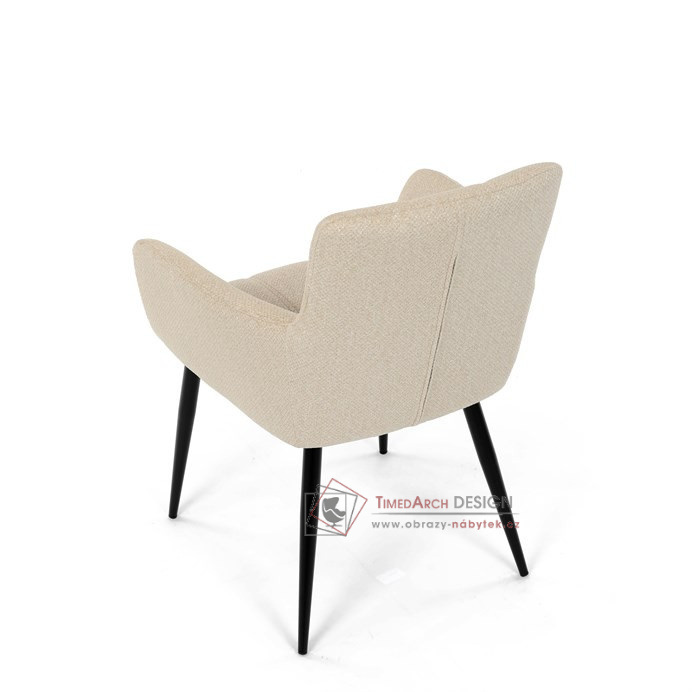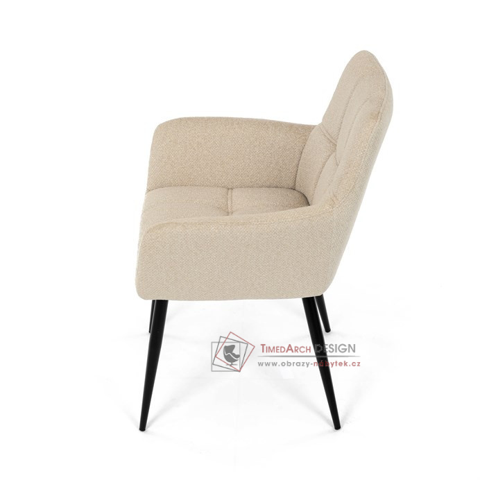 Toto stylová jídelní křeslo nabízí vysoký komfort díky čalounění z kvalitní látky a mekkému sedáku z PU pěny. Černé kovové nohy zajišťují stabilitu a dodávají židli jemný industriální nádech. Komfortní područky a ergonomické provedení oceníte při každém posezení. Křeslo se hodí nejen do domácí jídelny, ale i do restauračních prostor, kde vytvoří útulnou atmosféru.