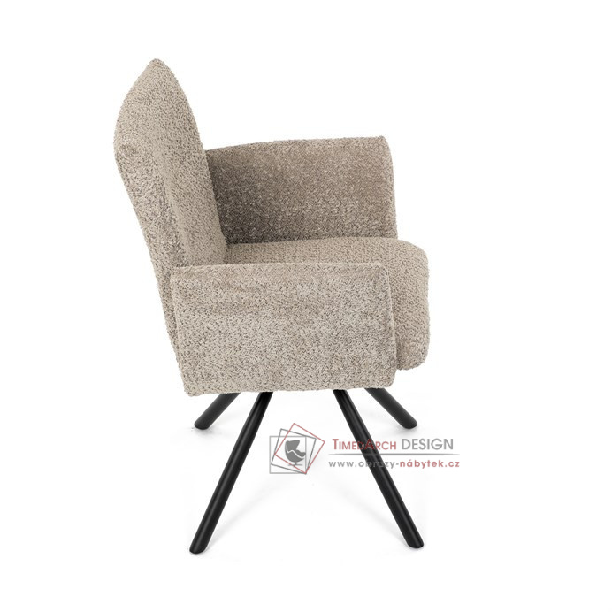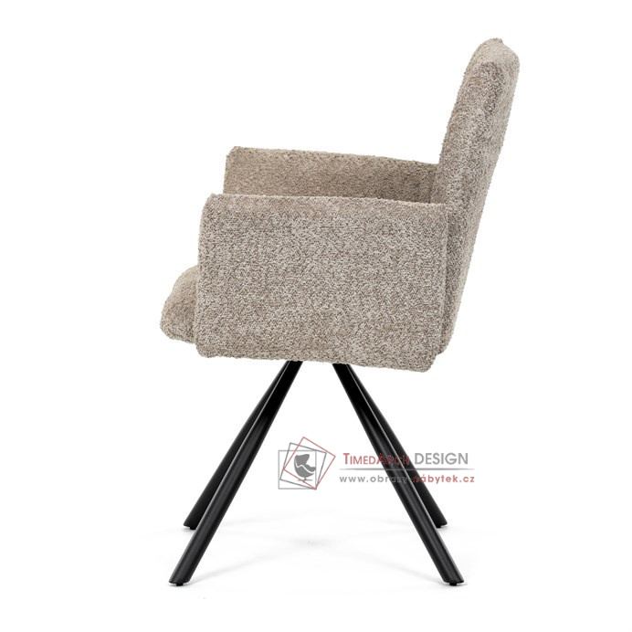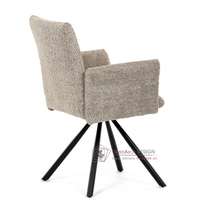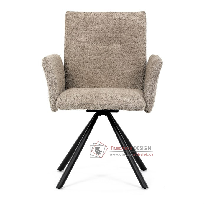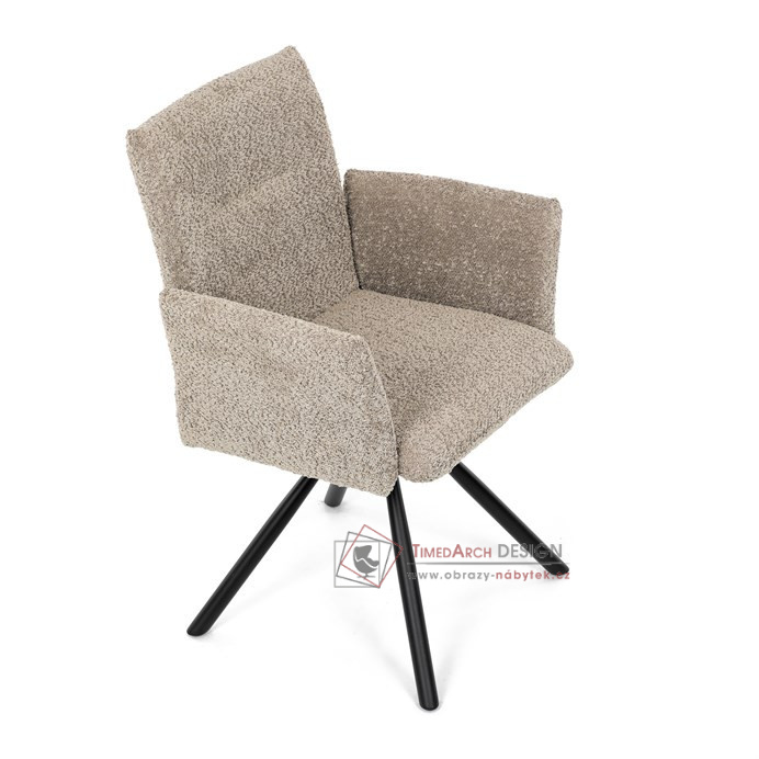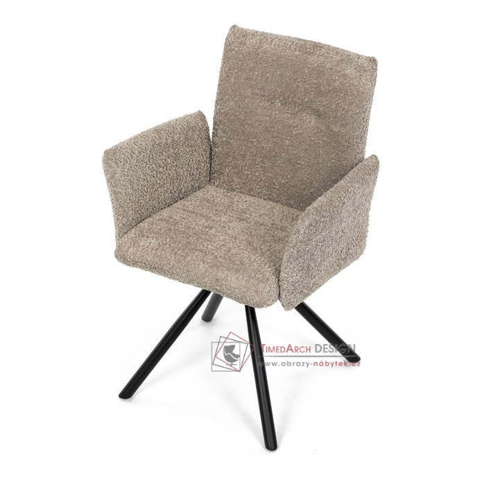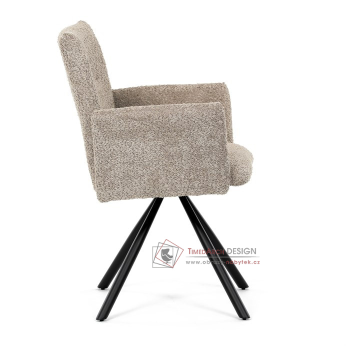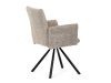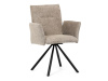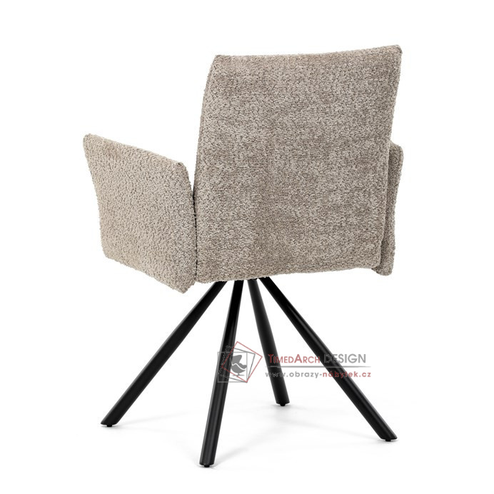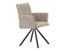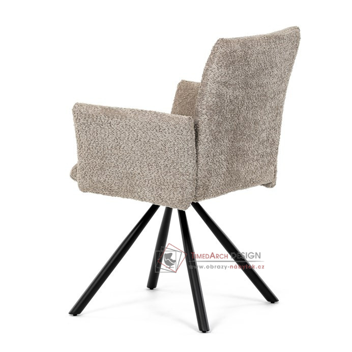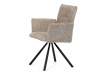 Otočná židle s robustní kovovou podnoží je vybavena pohodlnými područkami a látkou Bouclé, která zajišťuje příjemný a stylový vzhled. Polstrování z PU pěny nabízí měkké sezení, zatímco otočný mechanismus L90°/P90° s funkcí automatického vracení sedáku do základní polohy umožňuje snadné otáčení pro maximální flexibilitu. Černá kovová centrální podnož dodává židli stabilitu a moderní vzhled. Tato židle je ideální pro elegantní jídelny, kde se kombinuje komfort s moderním designem.