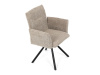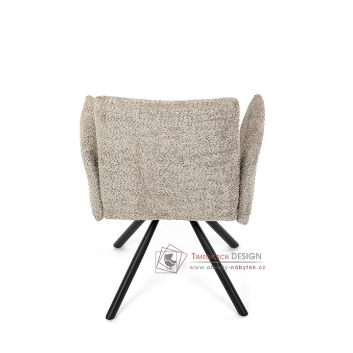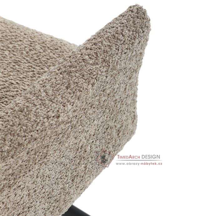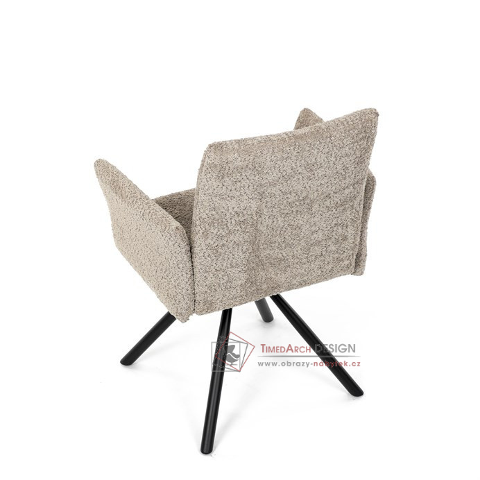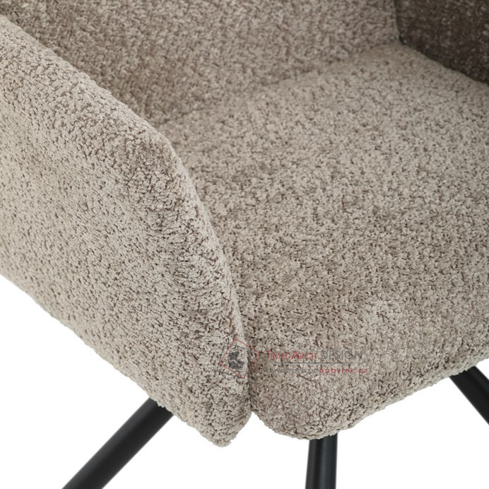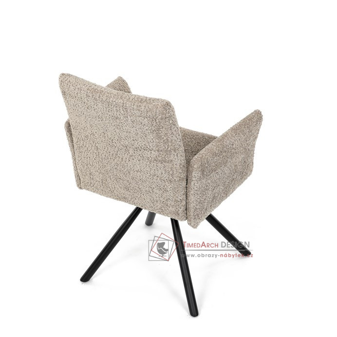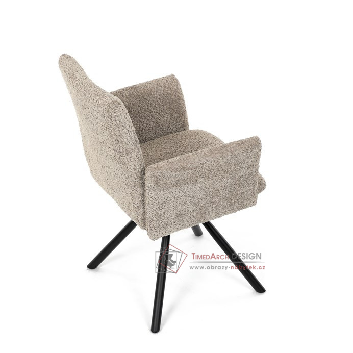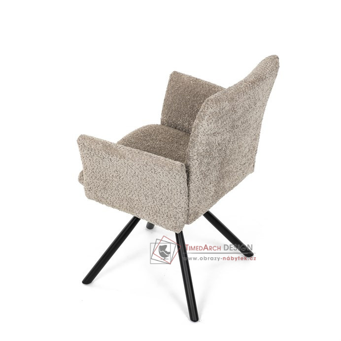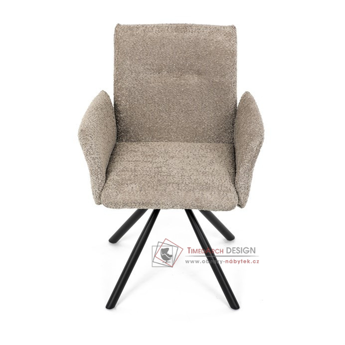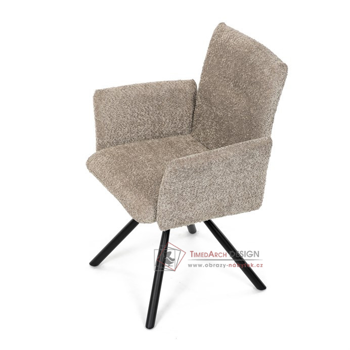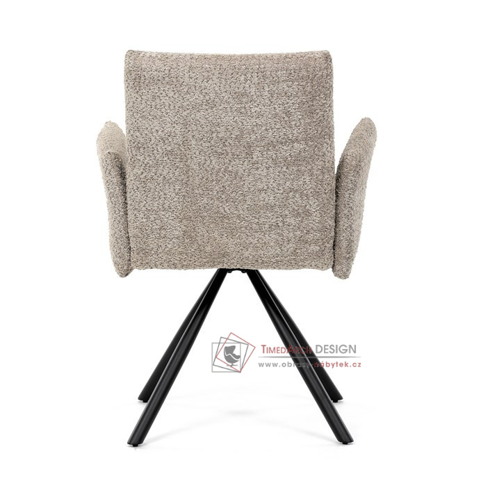 Otočná židle s robustní kovovou podnoží je vybavena pohodlnými područkami a látkou Bouclé, která zajišťuje příjemný a stylový vzhled. Polstrování z PU pěny nabízí měkké sezení, zatímco otočný mechanismus L90°/P90° s funkcí automatického vracení sedáku do základní polohy umožňuje snadné otáčení pro maximální flexibilitu. Černá kovová centrální podnož dodává židli stabilitu a moderní vzhled. Tato židle je ideální pro elegantní jídelny, kde se kombinuje komfort s moderním designem.