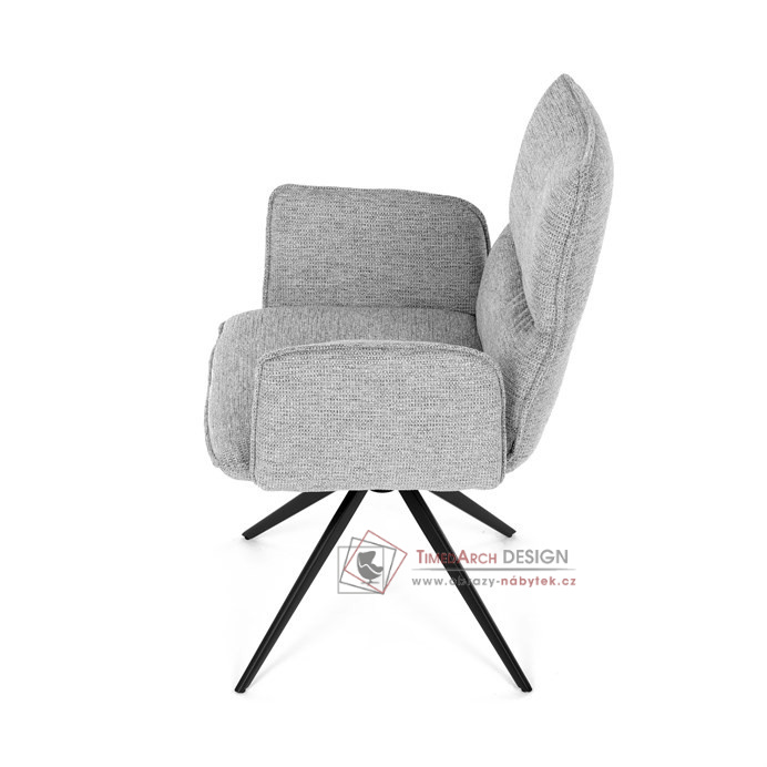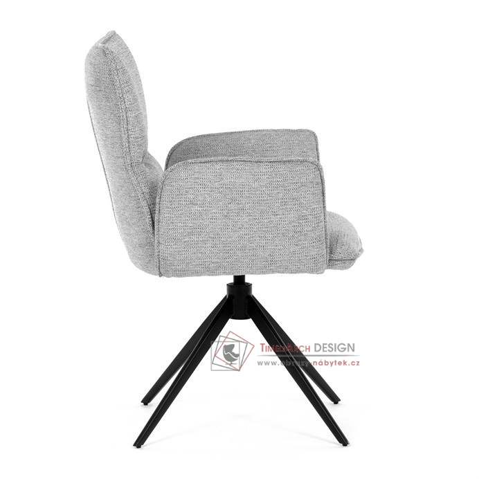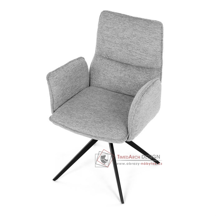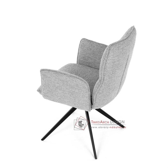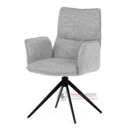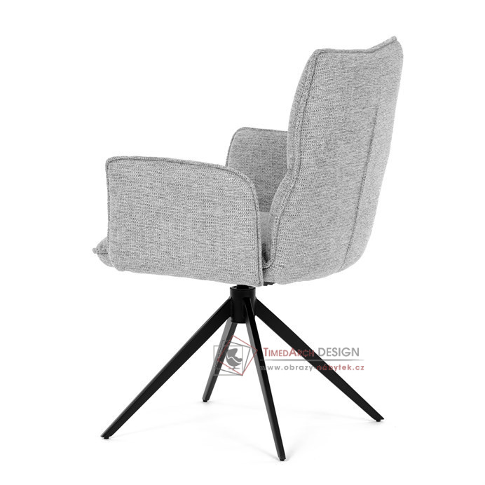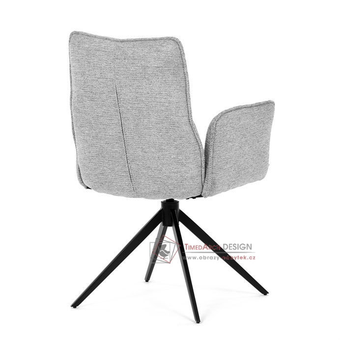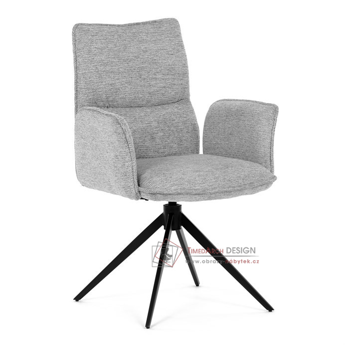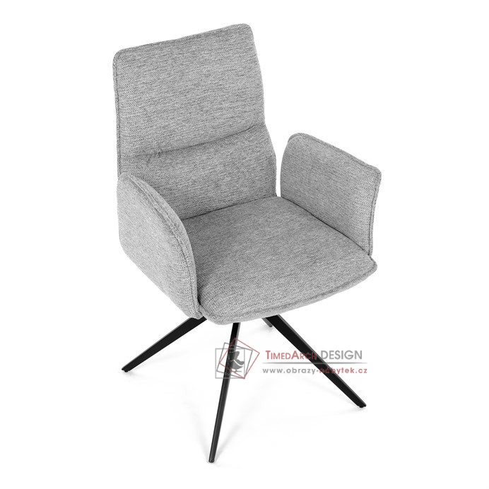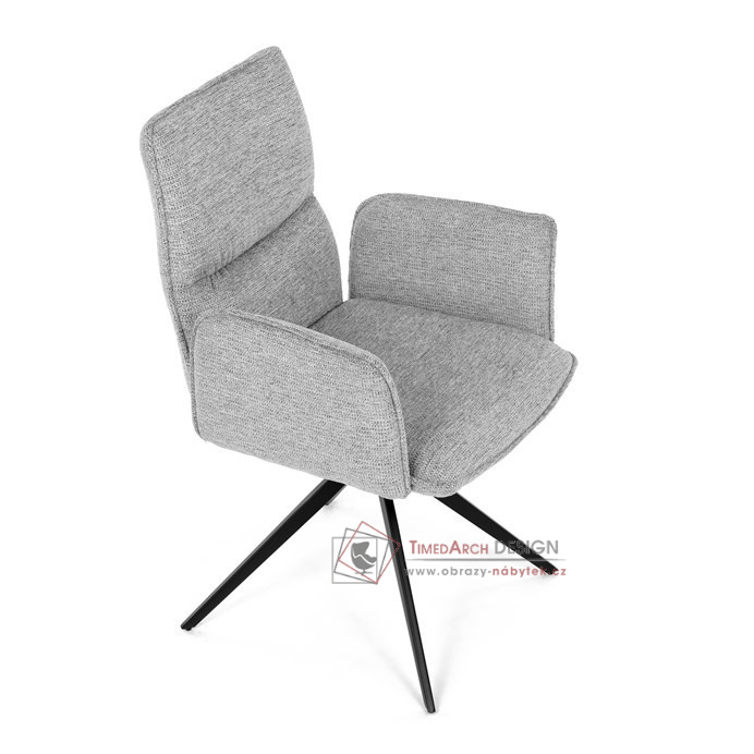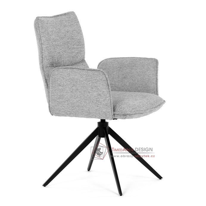 Čalounění z kvalitní šedé látky poskytuje příjemný a měkký povrch, který je zároveň odolný vůči běžnému opotřebení. Konstrukce židle je podpořena pevnou kovovou podnoží v černé barvě, která zajišťuje stabilitu a dlouhou životnost. Integrované područky jsou ergonomicky tvarované a čalouněné stejným materiálem jako sedák a opěradlo, což zvyšuje komfort při delším sezení. Sedák i opěradlo jsou vyplněny hustou pěnou, která poskytuje dostatečnou oporu a pohodlí. Díky kompaktním rozměrům a elegantnímu vzhledu je židle vhodná do moderních jídelních prostor i kancelářských zasedacích místností. Nosnost židle odpovídá standardním požadavkům pro běžné uživatele, což z ní činí univerzální řešení pro různé typy interiérů.