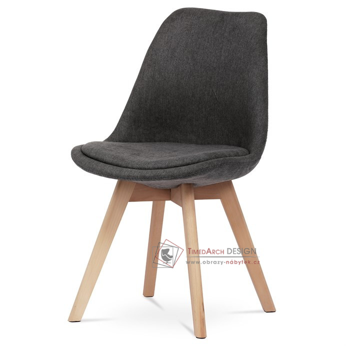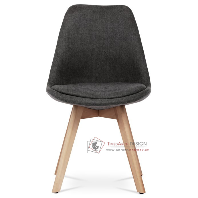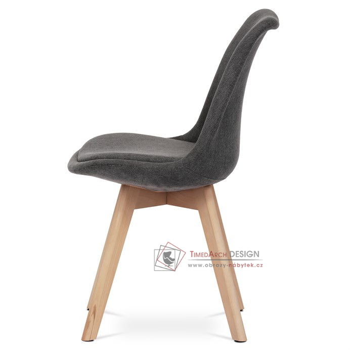 Jídelní židle s tvarovaným čalouněným korpusem v šedé barvě, vybavená pohodlným polstrovaným sedákem, který ladí s opěrkou.