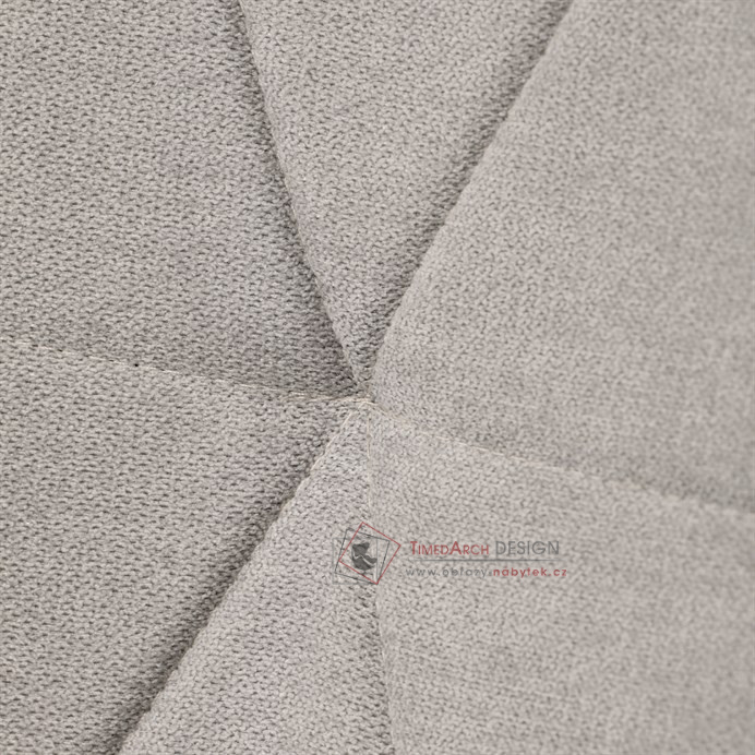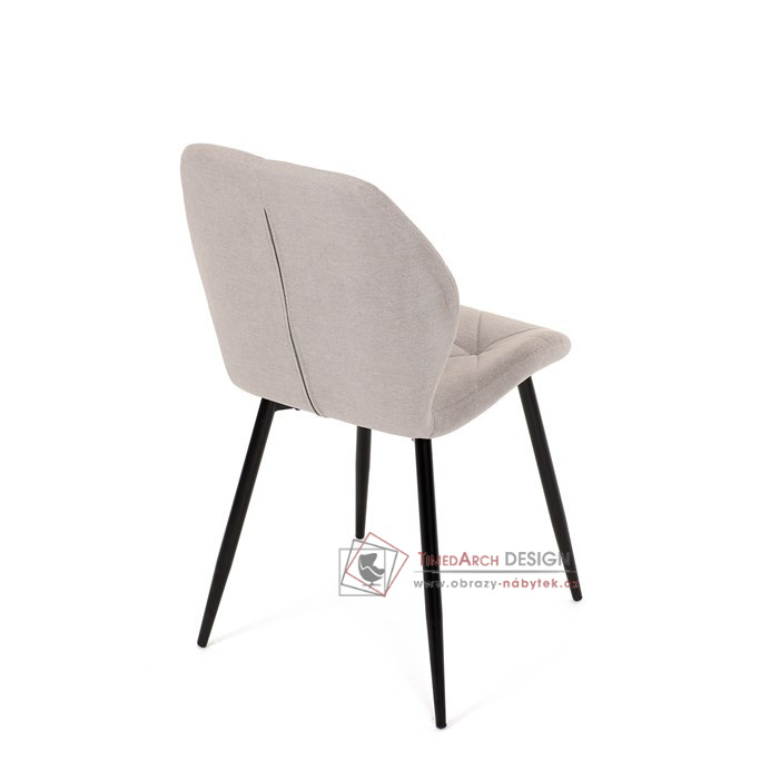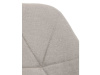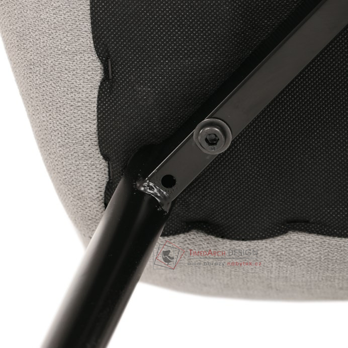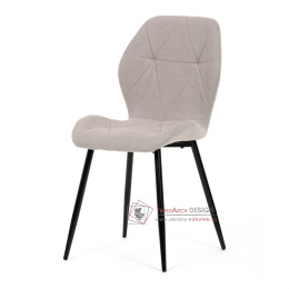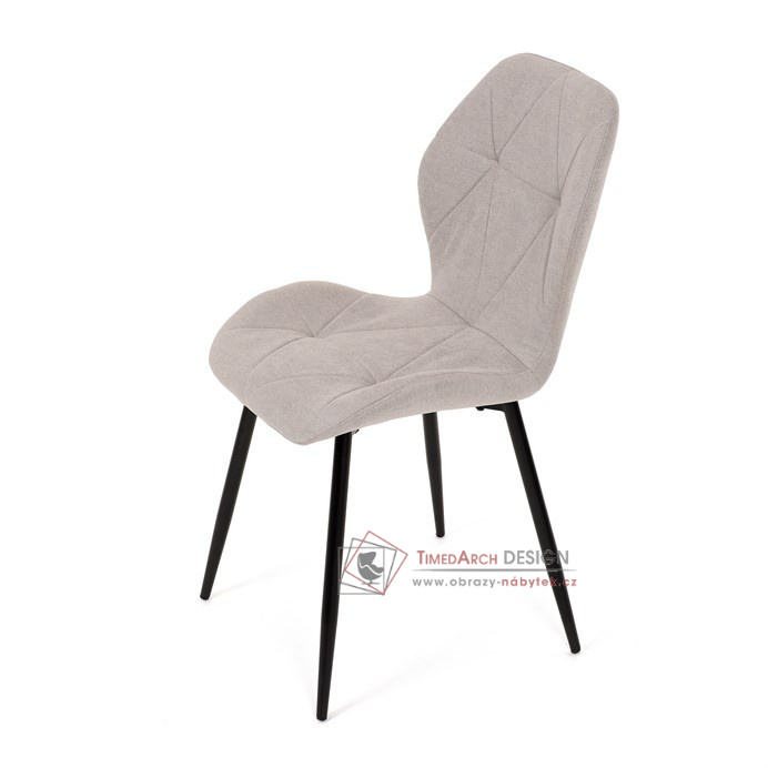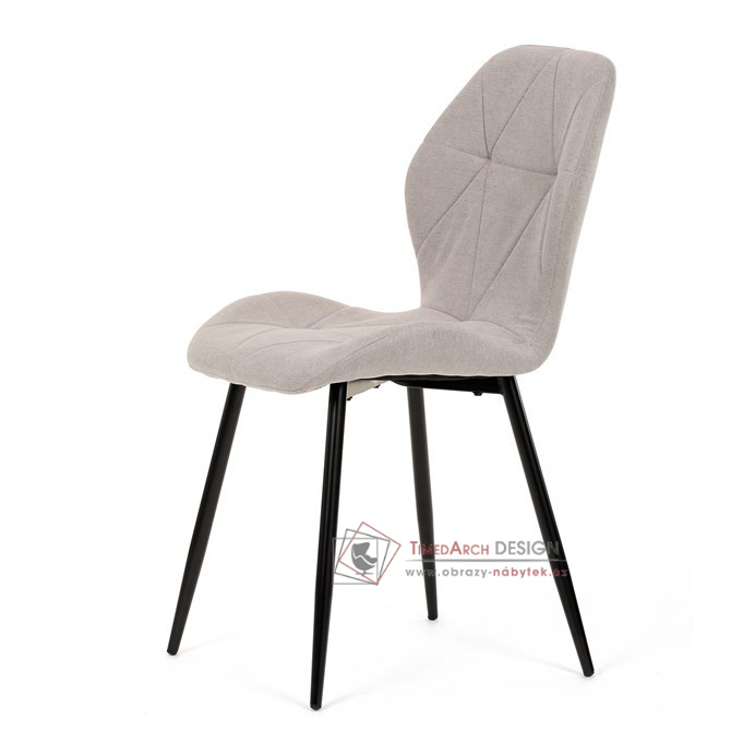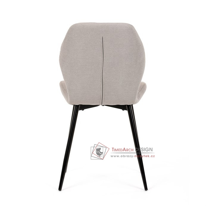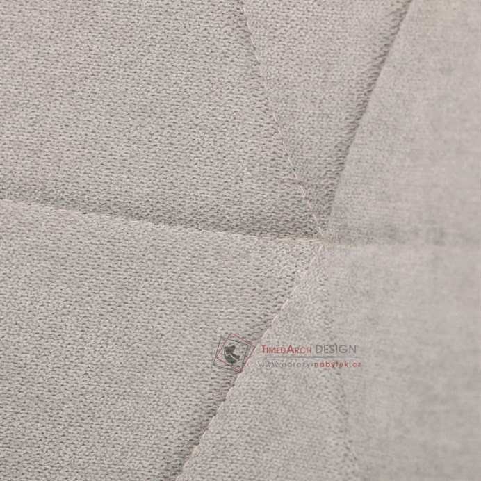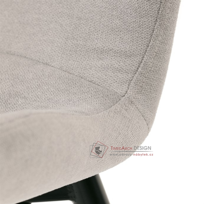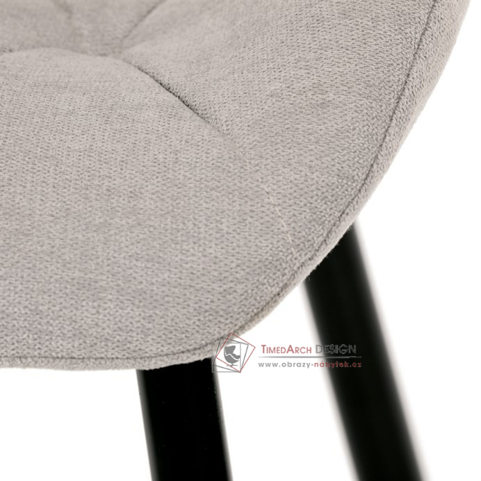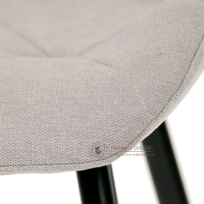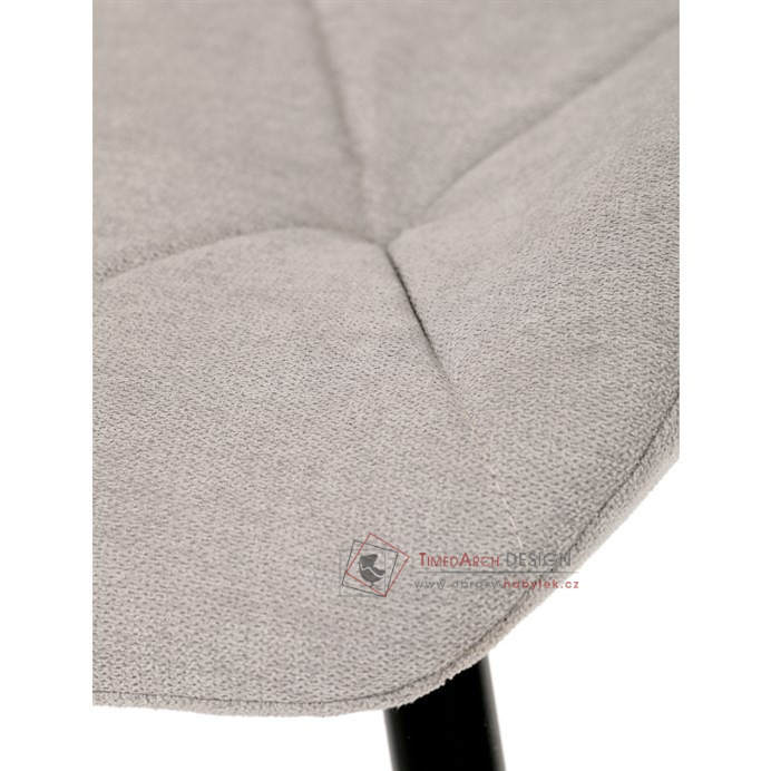 Sedák a opěrák židle tvoří skořepina specifického tvaru očalouněná prošitou látkou barvy světle šedé.