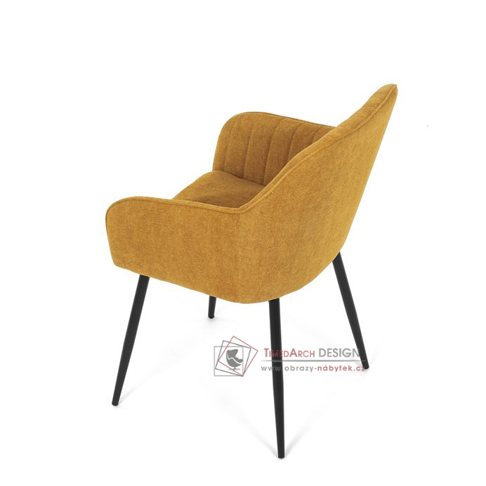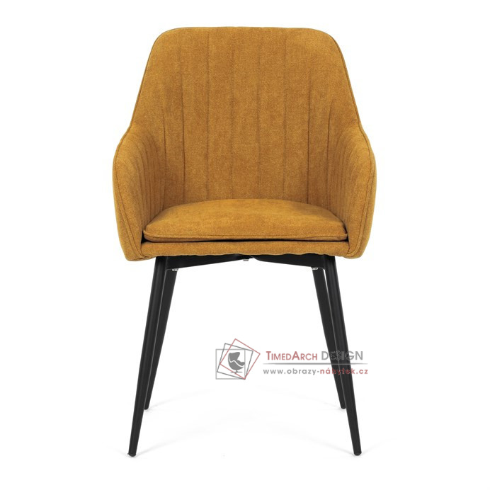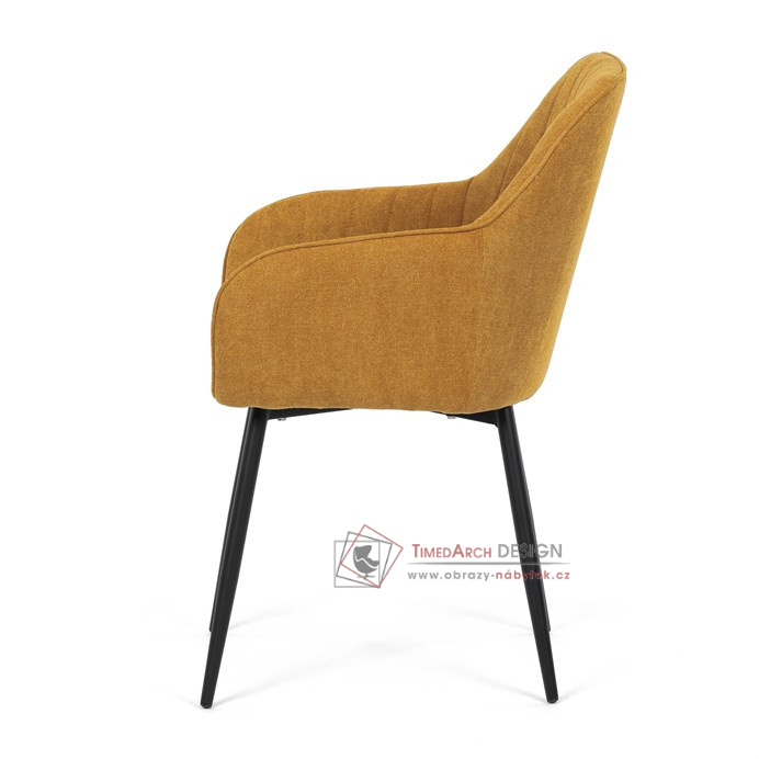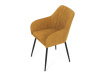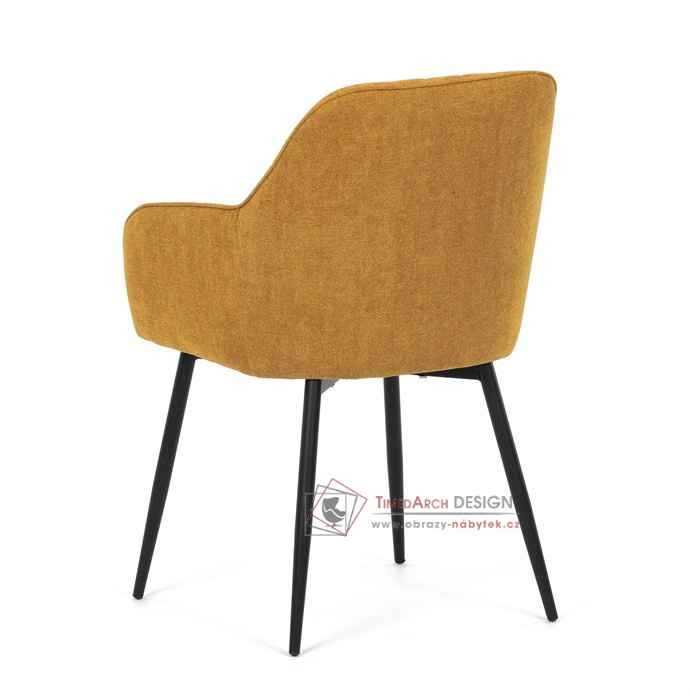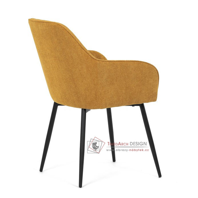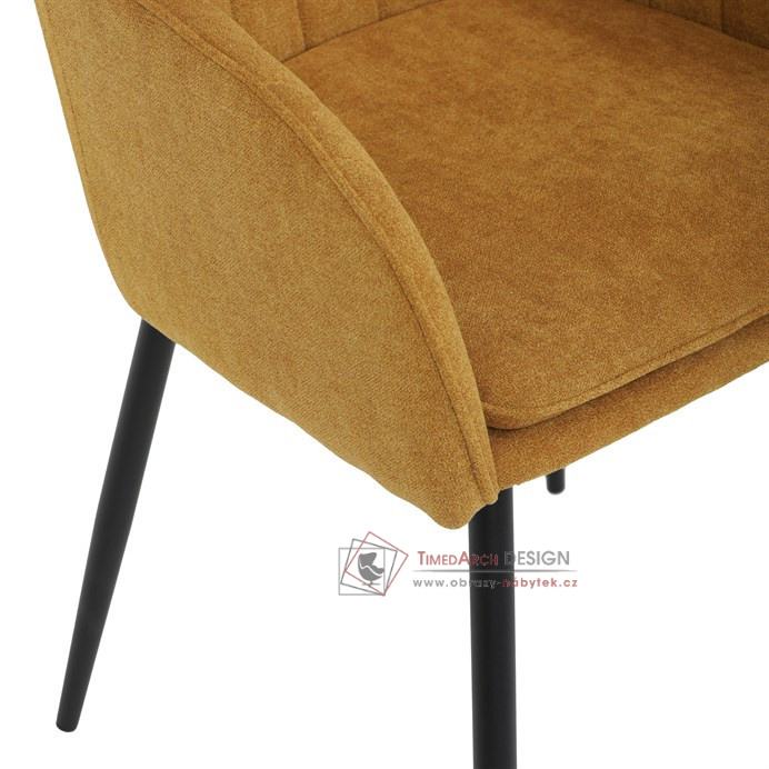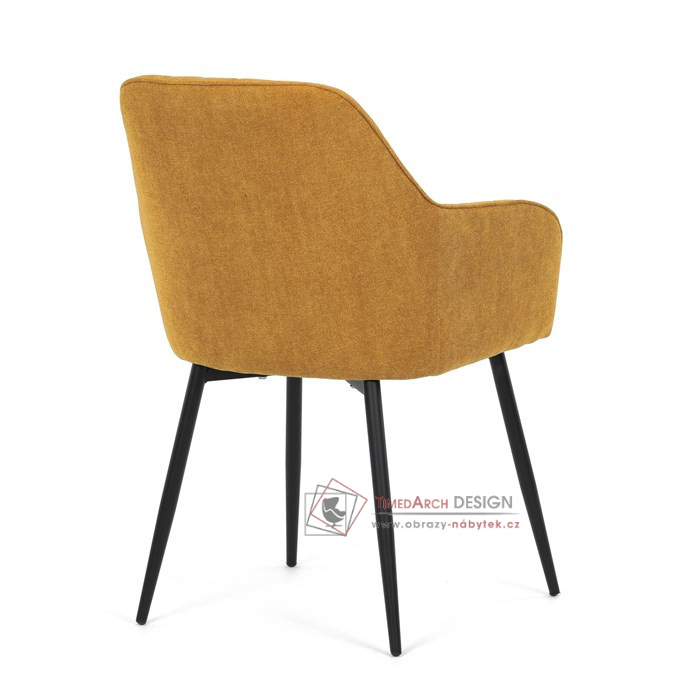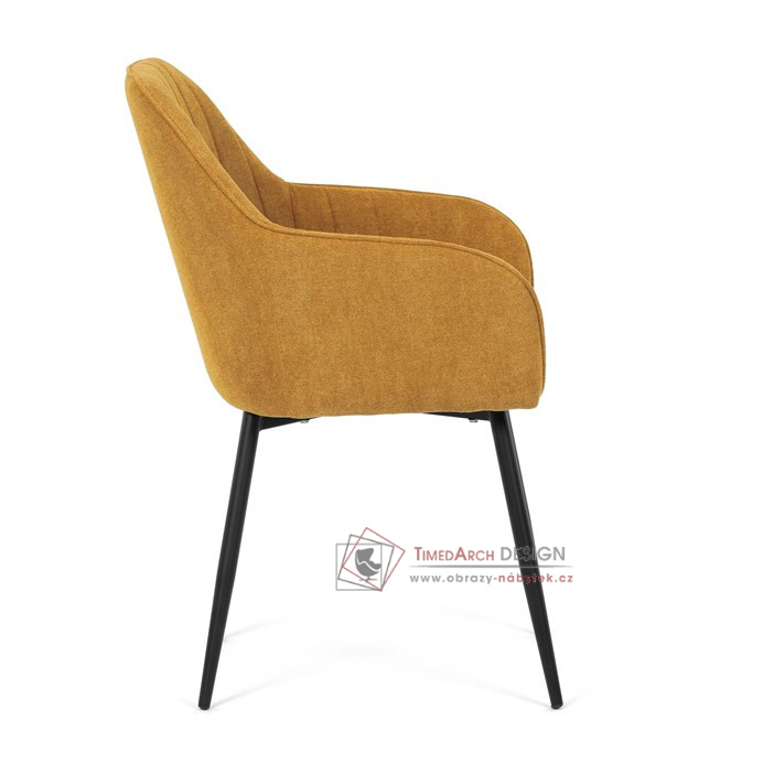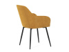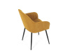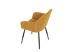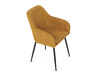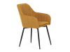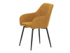 Je čalouněné hladkou žlutou látkou, která je nejen trvanlivá, ale také příjemná na dotek. Komfort při sezení zajistí pohodlné područky a měkká pěnová výplň. Pevná kovová konstrukce černé barvy s s nohami kruhového profilu dodává stabilitu a elegantní vzhled. Toto jídelní křeslo je ideální volbou pro moderní jídelny, kde se snoubí pohodlí s estetikou a dlouhou životností.