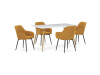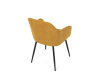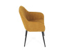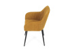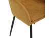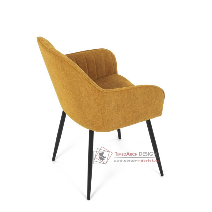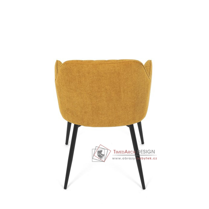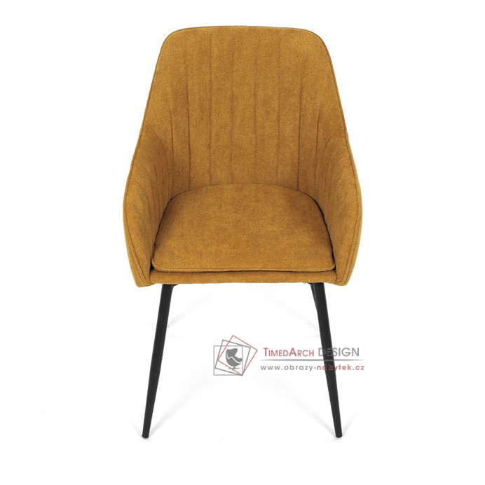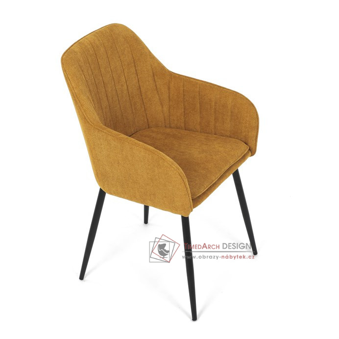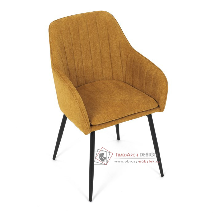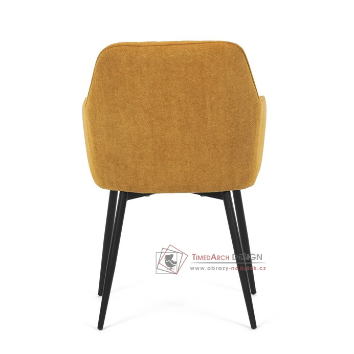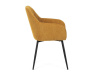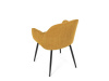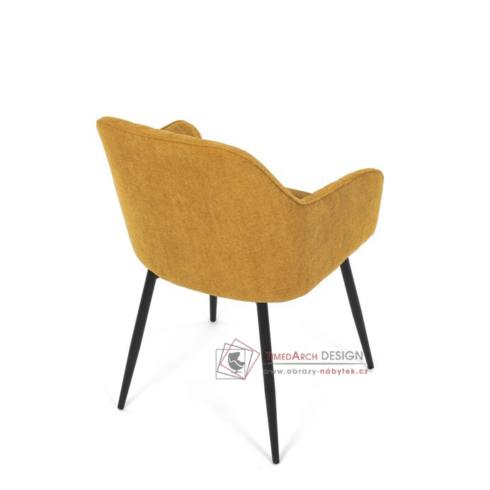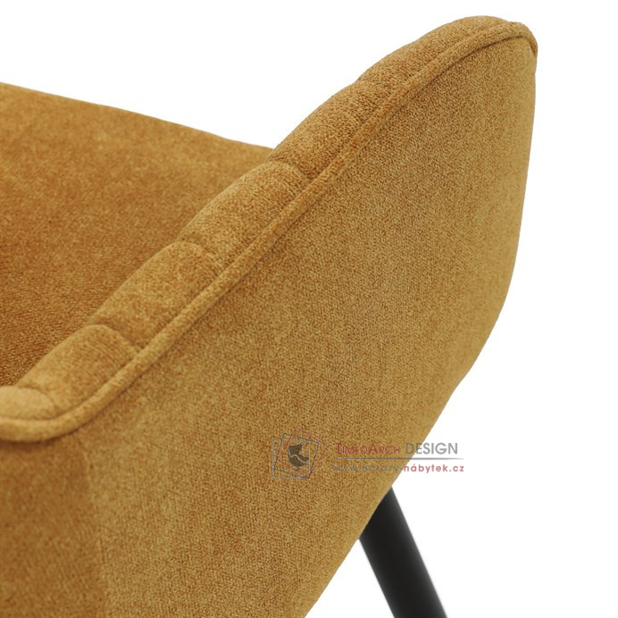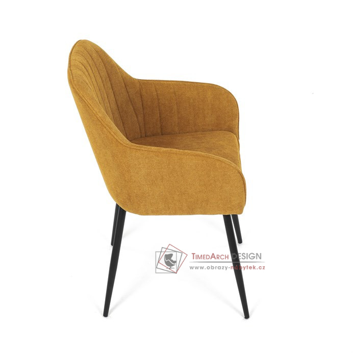 Je čalouněné hladkou žlutou látkou, která je nejen trvanlivá, ale také příjemná na dotek. Komfort při sezení zajistí pohodlné područky a měkká pěnová výplň. Pevná kovová konstrukce černé barvy s s nohami kruhového profilu dodává stabilitu a elegantní vzhled. Toto jídelní křeslo je ideální volbou pro moderní jídelny, kde se snoubí pohodlí s estetikou a dlouhou životností.