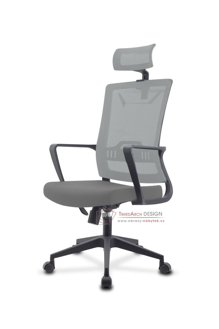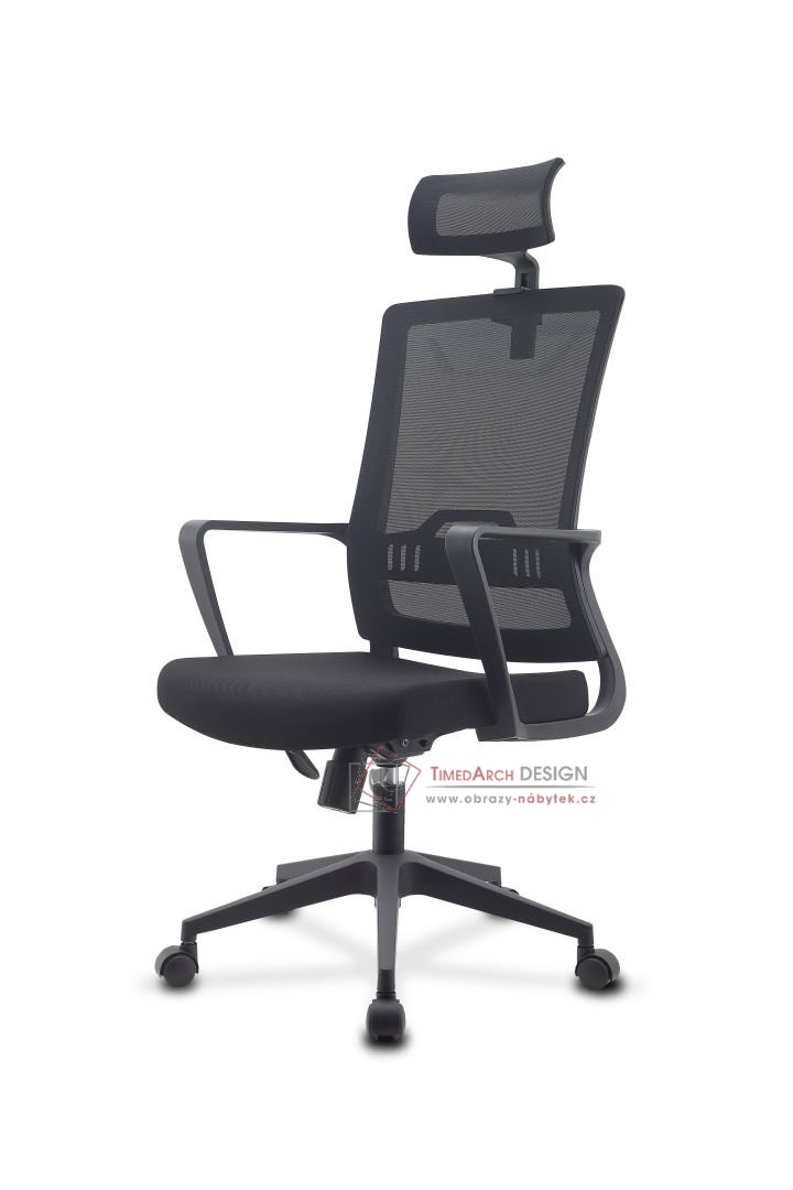 S opěrkou hlavy, věšák na oblečení v zadní části židle, spodní kostrukce je kovová. Plynový zdvih D100-45 mm. Náklon - uzamykací mechanismus. Materiál pružný nylon, síťovaná opěra. Kovový kříž.