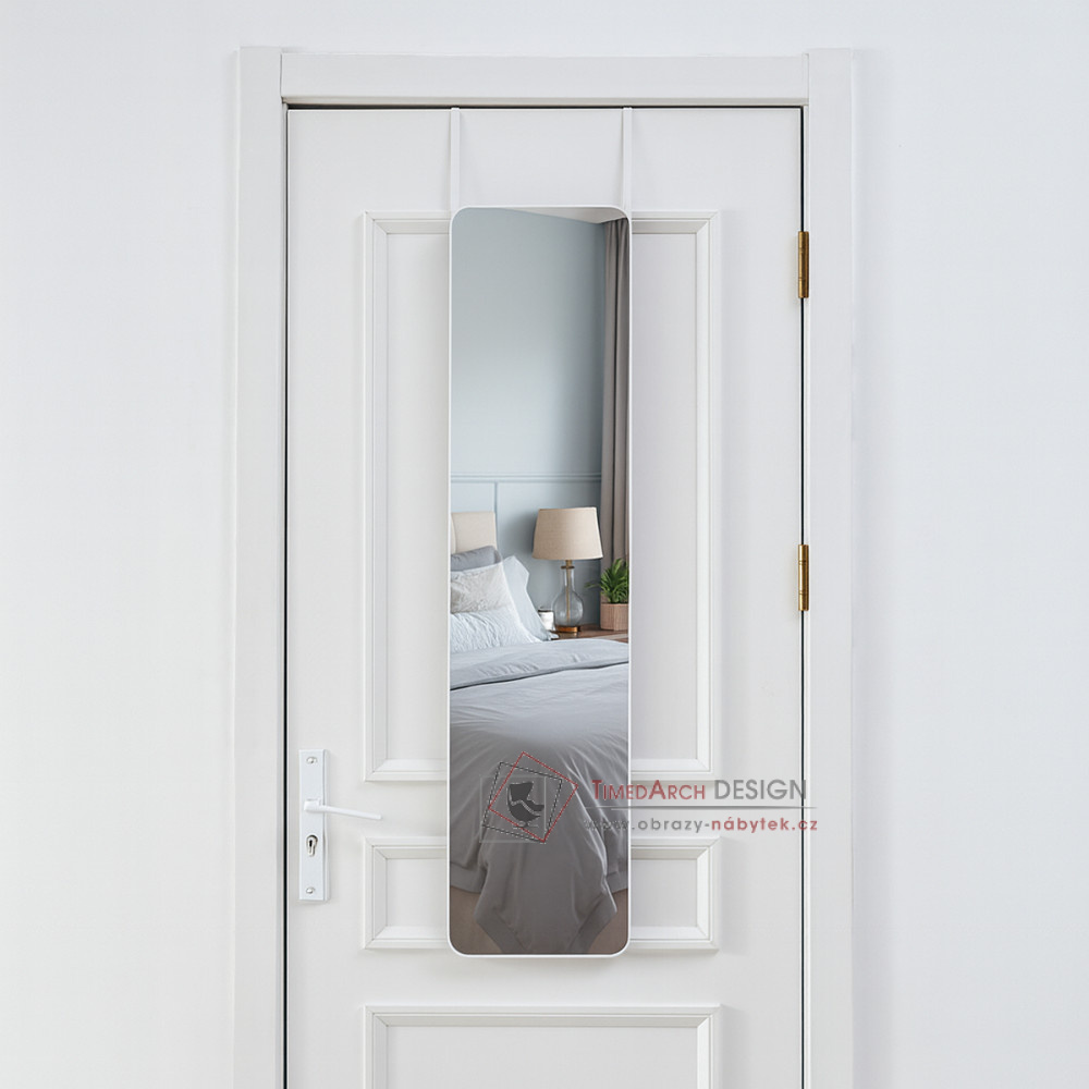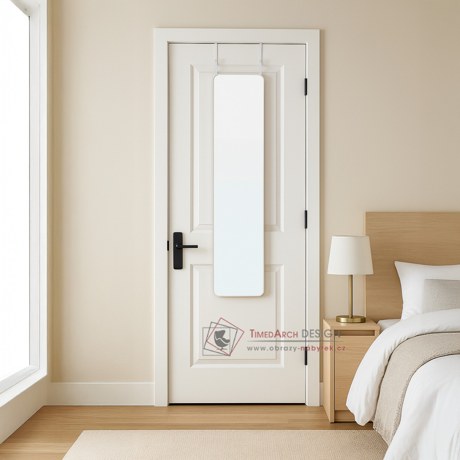 Může se snadno připevnit na dveře nebo stěnu, čímž šetří prostor. Elegantní hliníkový rám v bílé barvě zaručuje stylový vzhled, který se hodí do každého interiéru. Zrcadlo je dodáváno s háčky, které umožňují přizpůsobit výšku podle vašich potřeb. Perfektní pro každodenní použití, jako je make-up nebo oblékání.