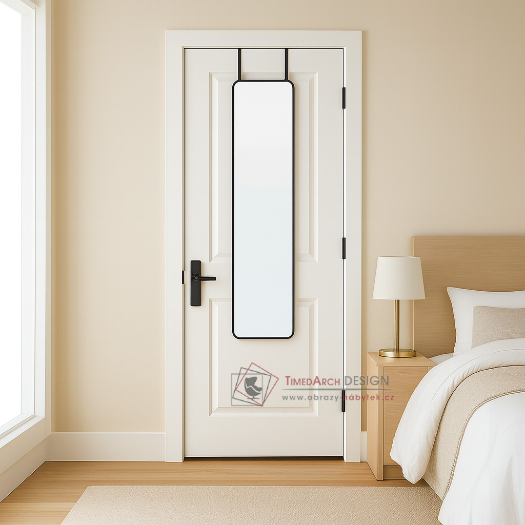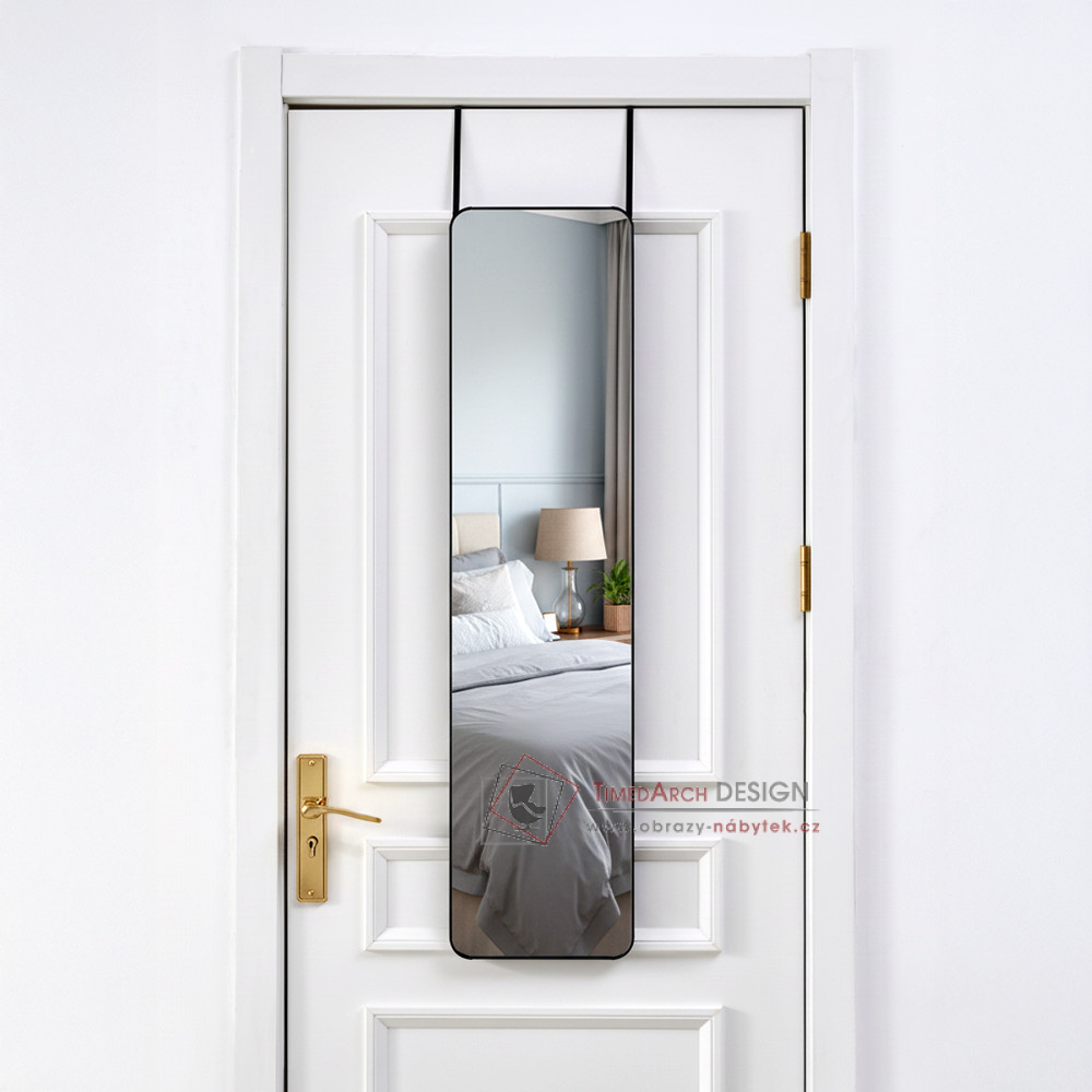 Může se snadno připevnit na dveře nebo stěnu, čímž šetří prostor. Elegantní hliníkový rám v černé barvě zaručuje stylový vzhled, který se hodí do každého interiéru. Zrcadlo je dodáváno s háčky, které umožňují přizpůsobit výšku podle vašich potřeb. Perfektní pro každodenní použití, jako je make-up nebo oblékání.